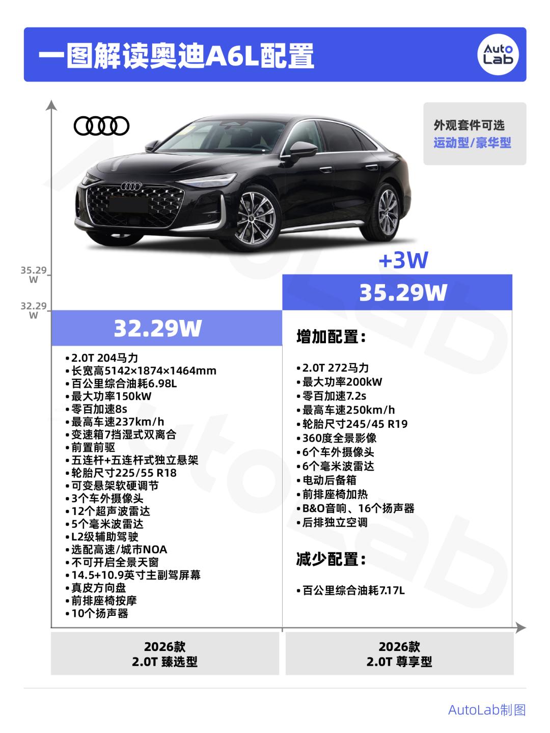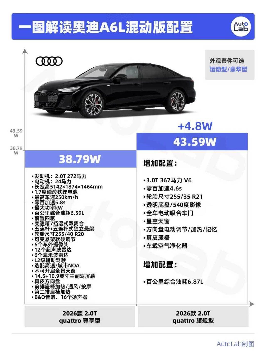 并解锁了空悬及后轮转向的选配资格,这个版本适合对驾驶品质有要求的北方朋友选择,在雨雪湿滑路面,quattro带给你的安全感,远超这3.5万元的差价。