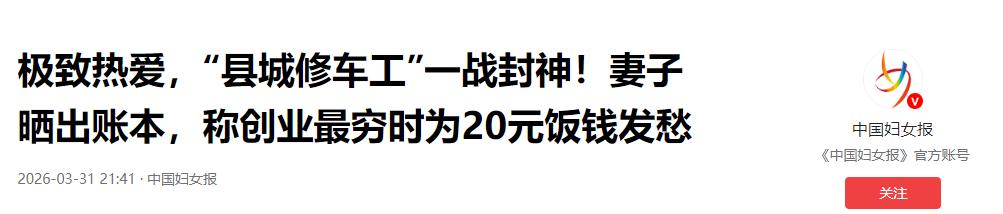 中国妇女报:极致热爱,“县城修车工”一战封神!妻子晒出账本,称创业最穷时为20元饭钱发愁