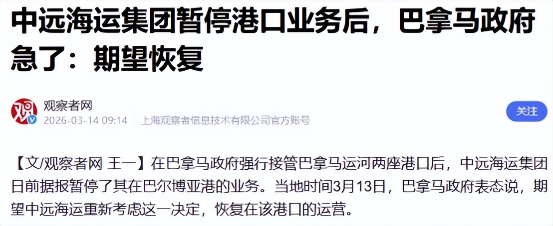 3月10日起,中远海运暂停巴尔博亚港相关业务,约4%货物交易量搁置。巴拿马官方反应迅速,以恳切之态表态,望中方重新审慎考量,勿终止此项业务往来。