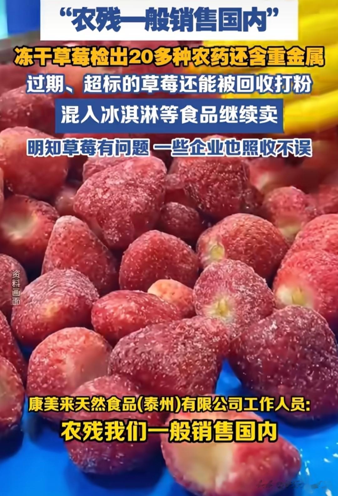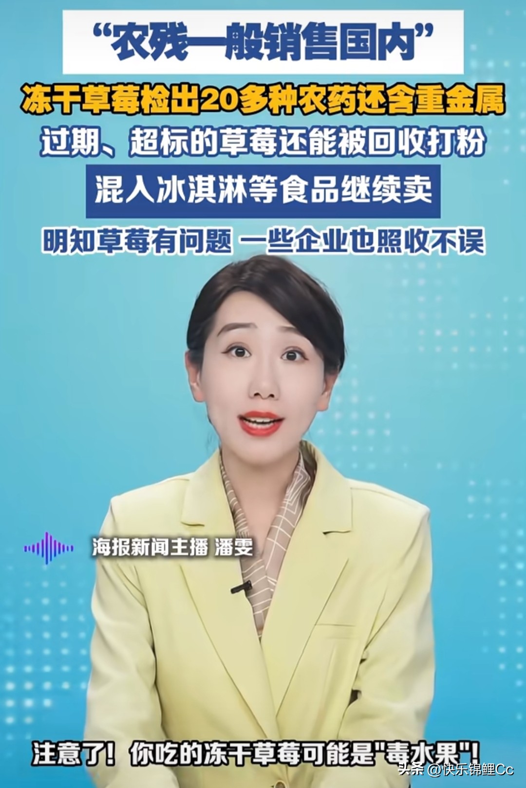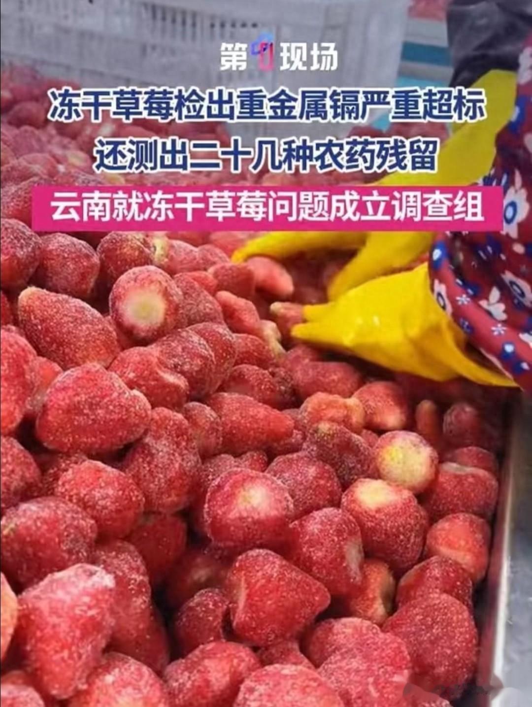 我刚看了下这个新闻视频,这个冻干草莓事件确实挺严重的,这是关乎人命安全的问题,不是一般的食品问题,不严查能行吗?种过庄稼的人都知道,草莓不打药长不好,农药养大的。不吃草莓,也不会缺乏营养影响健康,所以说这玩意还是少吃为妙。
