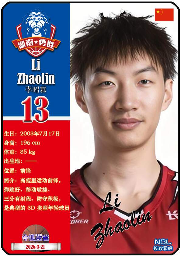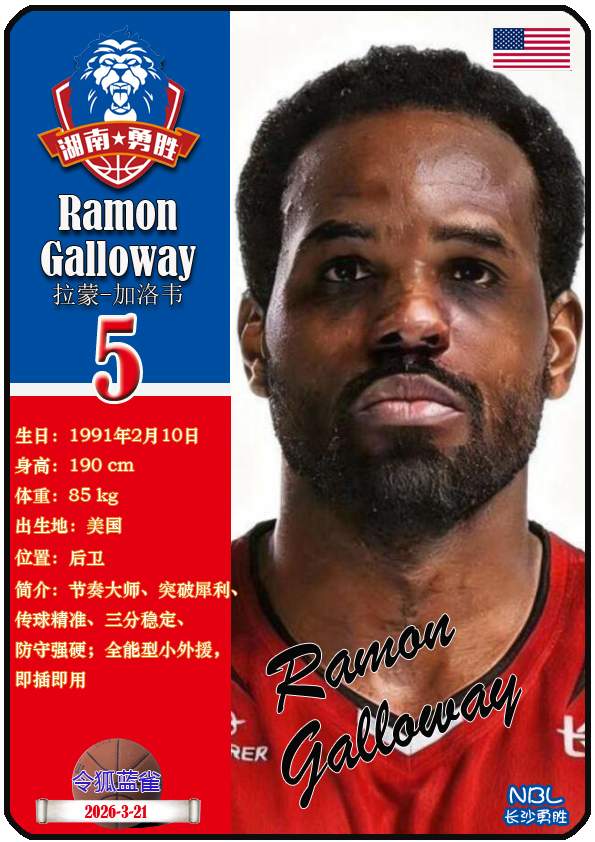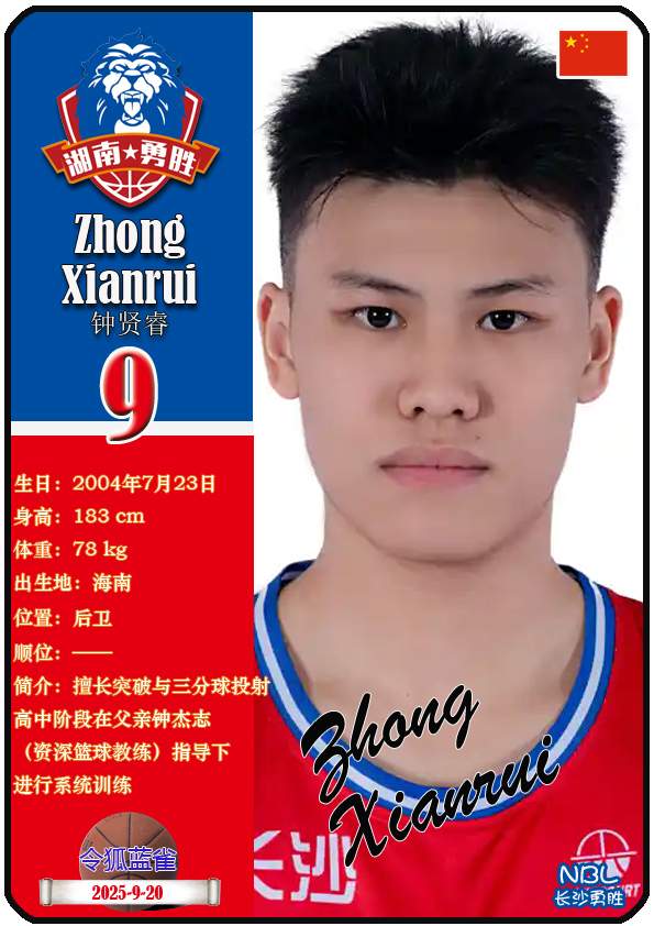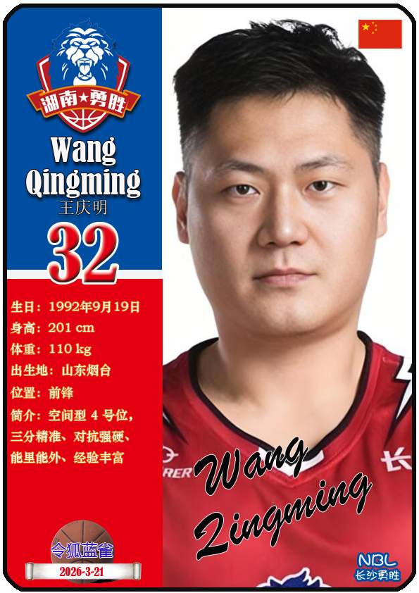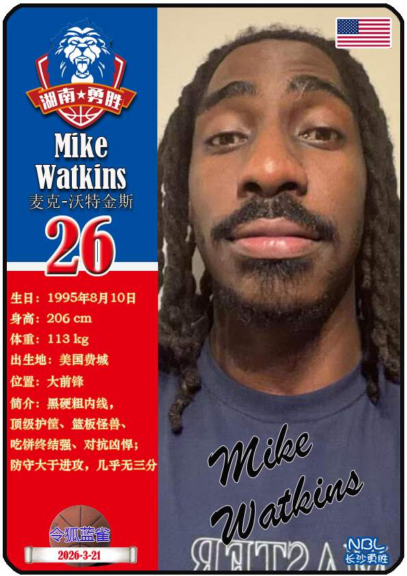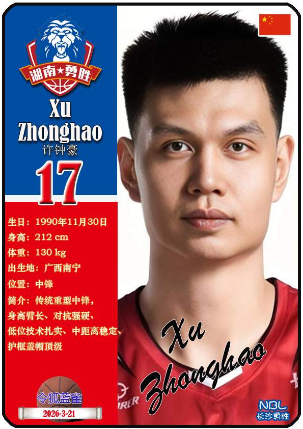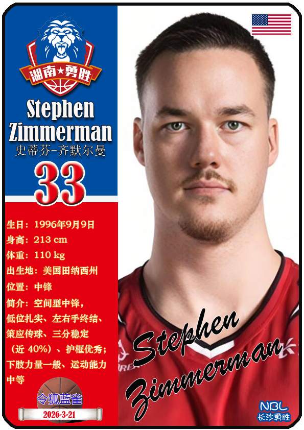 截至2026年3月21日,NBL长沙勇胜篮球俱乐部主教练是张伟,队内拥有球员史蒂芬-齐默尔曼、麦克-沃特金斯、拉蒙-加洛韦等。本期以球星卡的形式展示目前NBL长沙勇胜篮球俱乐部的17名球员(按球衣号码排序):