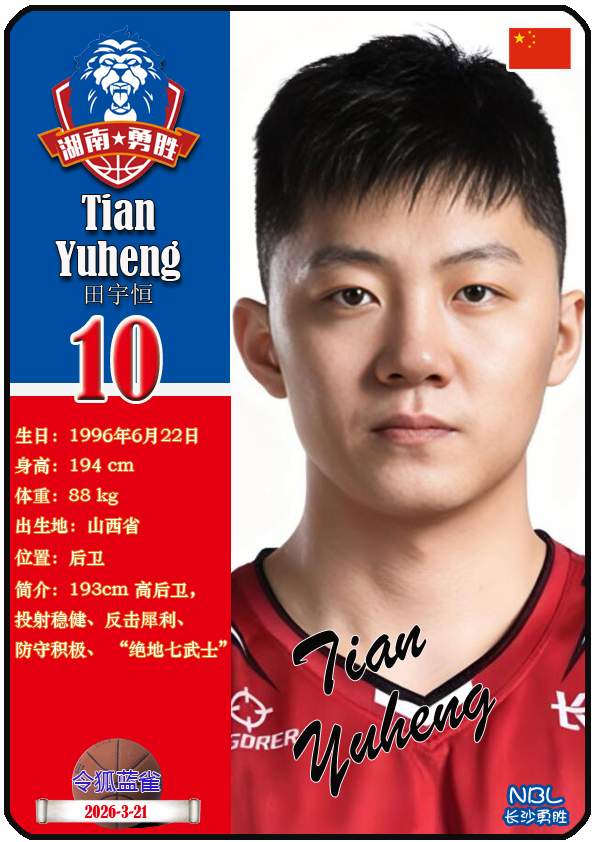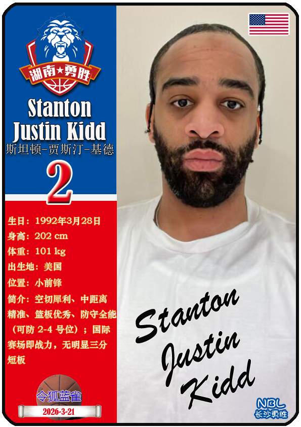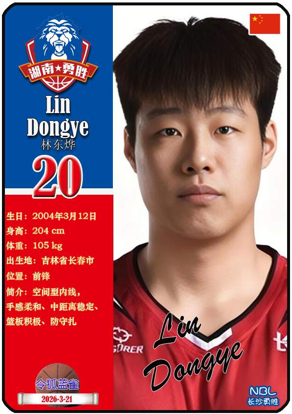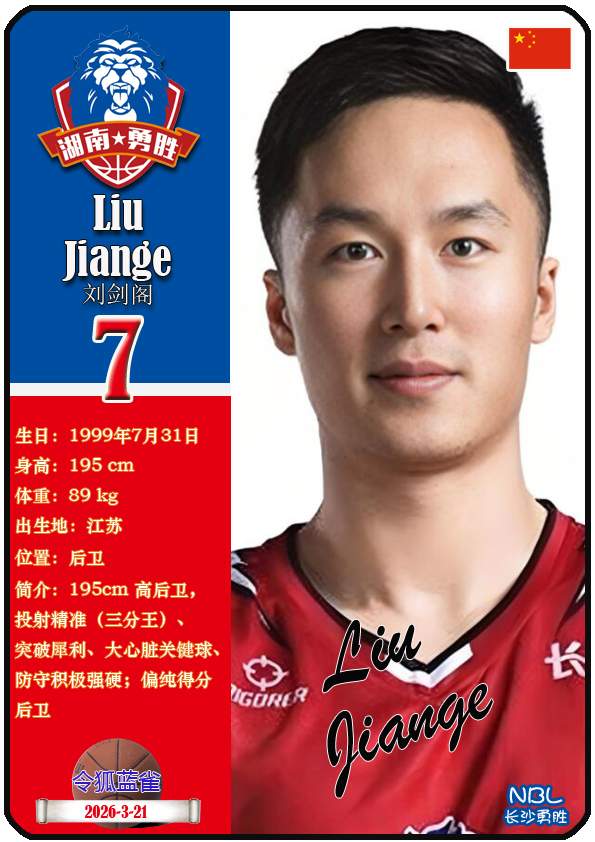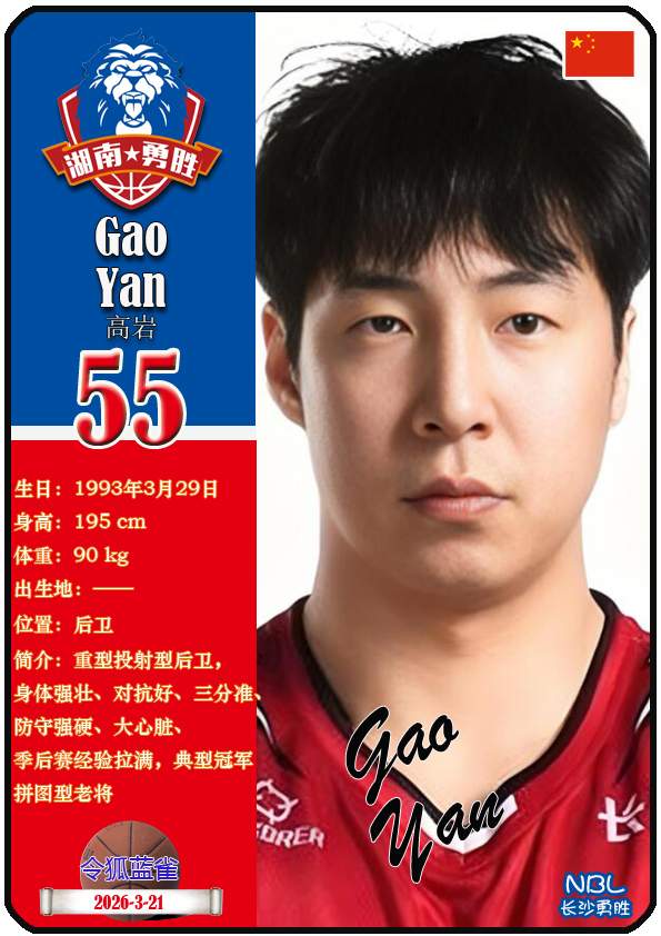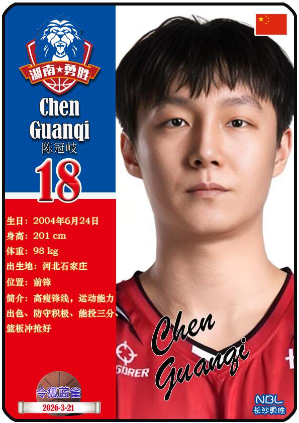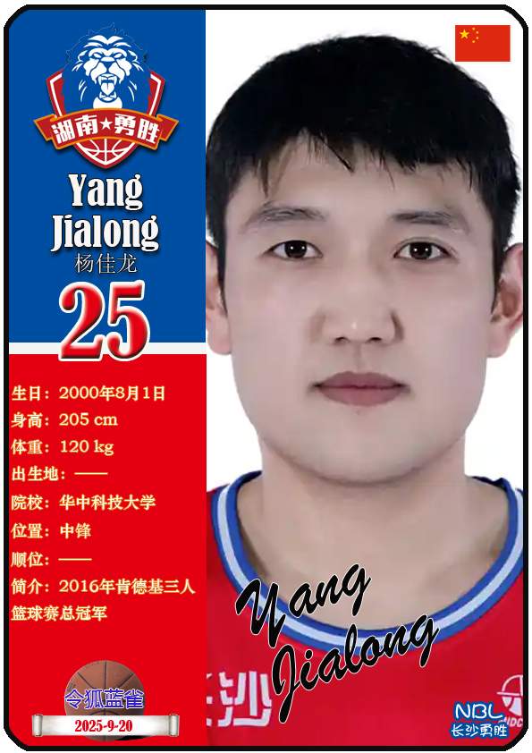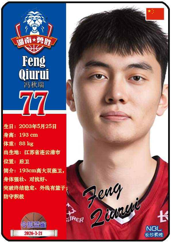 截至2026年3月21日,NBL长沙勇胜篮球俱乐部主教练是张伟,队内拥有球员史蒂芬-齐默尔曼、麦克-沃特金斯、拉蒙-加洛韦等。本期以球星卡的形式展示目前NBL长沙勇胜篮球俱乐部的17名球员(按球衣号码排序):