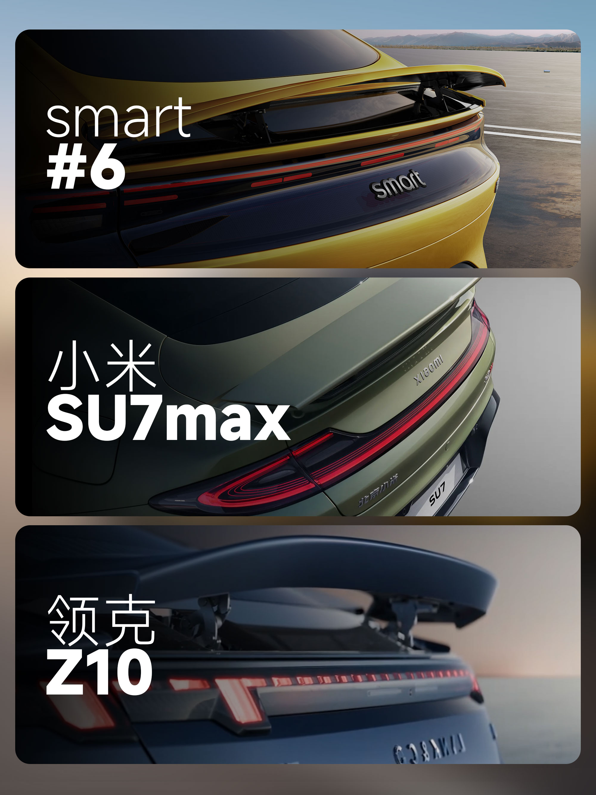 领克Z10、小米SU7MAX尾翼多侧重隐藏与升降速度,smart精灵6号强化迎送宾仪式感,升降姿态优雅,将豪华感融入细节