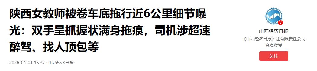 信息来源:山西经济日报:陕西女教师被卷车底拖行近6公里细节曝光:双手呈抓握状满身拖痕,司机涉超速醉驾、找人顶包等
