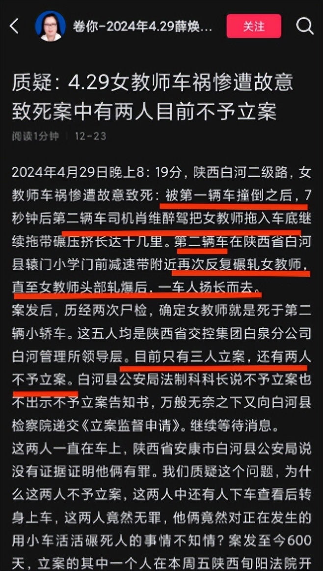2024 年发生在陕西白河的女教师遇害案,时隔近两年依旧让公众揪心。这名坚守讲台的女性在深夜回家途中遭遇无妄之灾,从被车辆撞击到卷入车底拖行致死,全程充满绝望与痛苦,而肇事方的醉驾、逃逸、顶包、毁证等一系列恶行,更是突破了人性底线。
