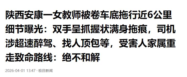 极目新闻:陕西安康一女教师被卷车底拖行近6公里细节曝光:双手呈抓握状满身拖痕,司机涉超速醉驾、找人顶包等,受害人家属重走致命路线:绝不和解