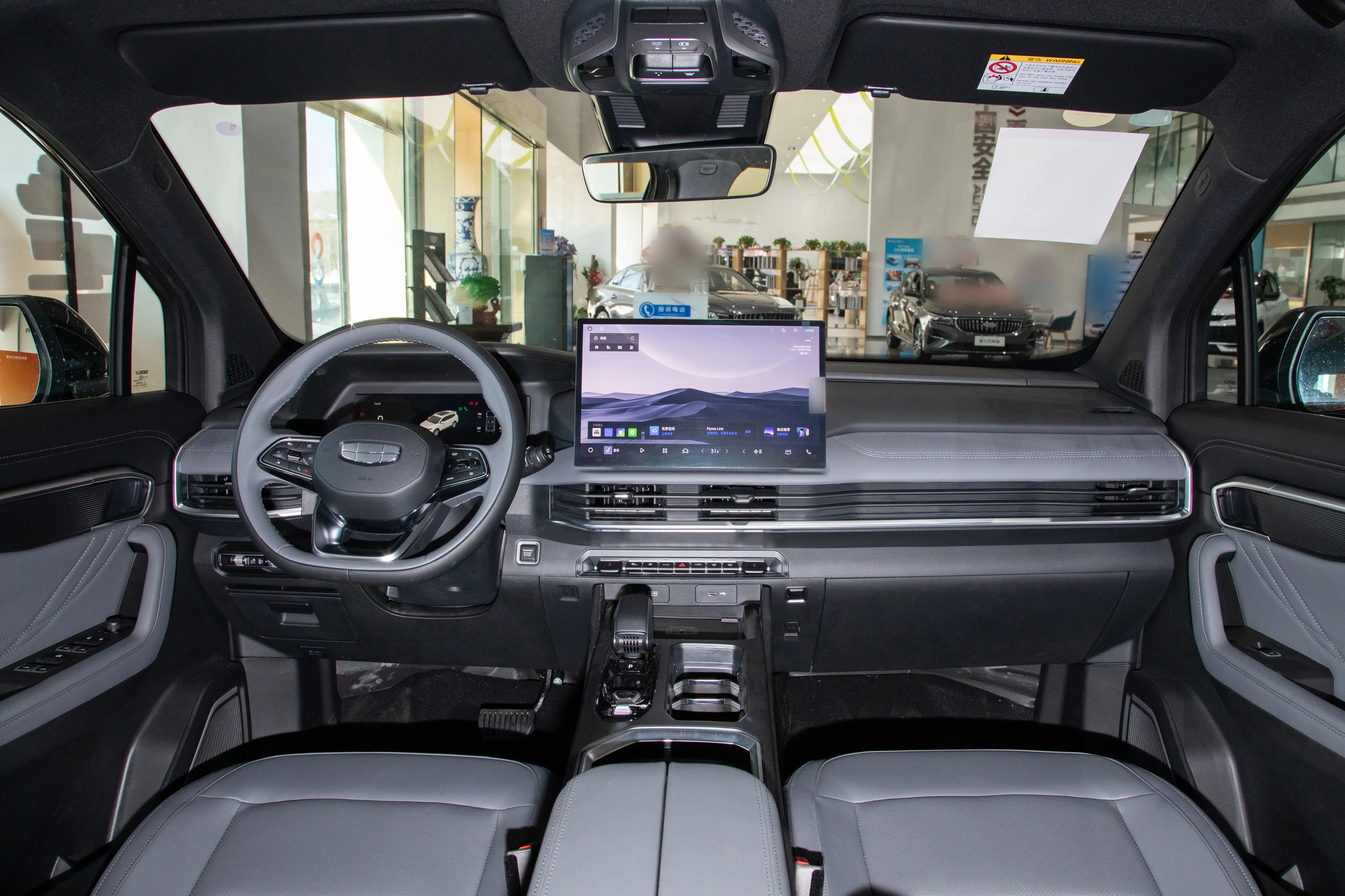 灰黑的内饰配色看起来不单调,中控布局简洁富有科技感,空调出风口采用了贯穿式元素,10.2英寸全液晶仪表盘可显示信息丰富,皮质多功能方向盘左侧是智能驾驶辅助按键,右侧是仪表盘菜单按键,车载智能系统用的是Flyme Auto,14.6英寸悬浮式中控屏支持导航,蓝牙/车载电话,4种手机互联,车联网,4G网络,OTA升级等功能,L2级智能驾驶辅助系统也给配备了。