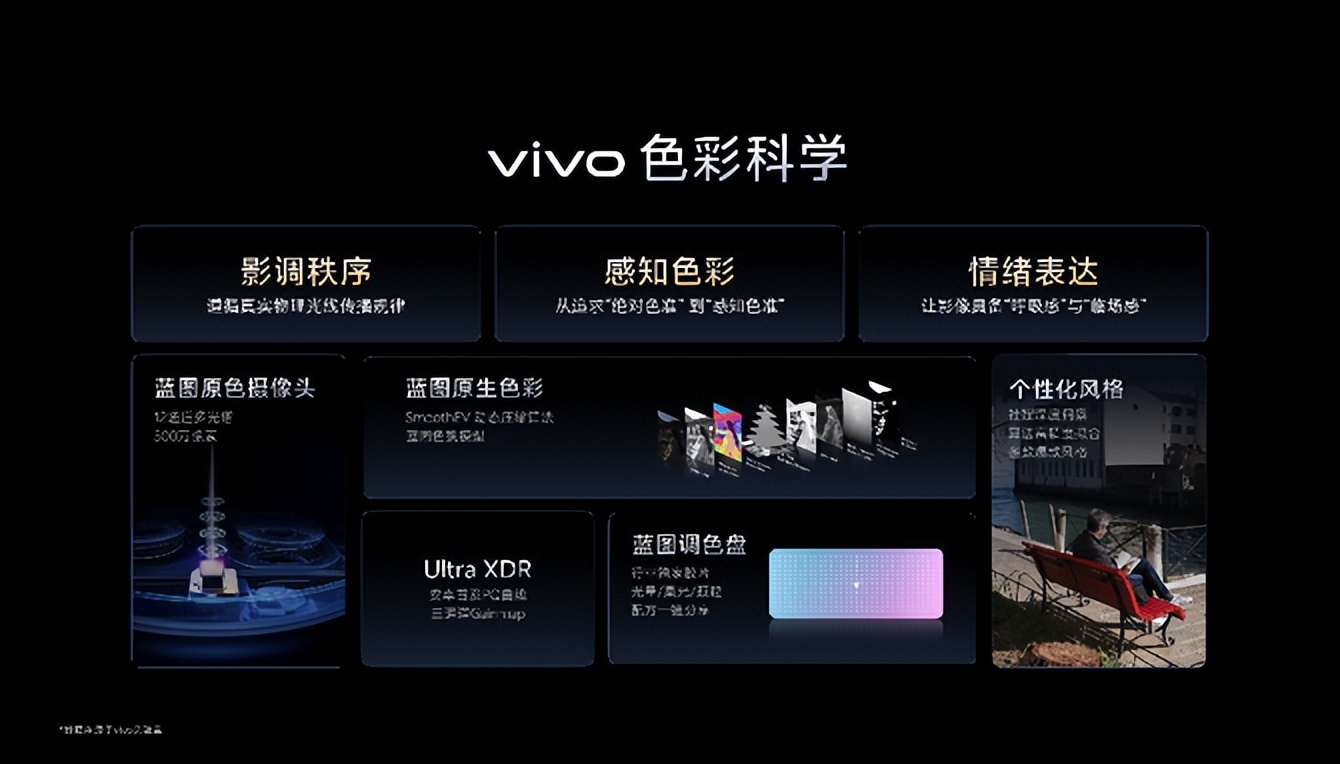 如果说专业级的硬件为创作表达提供了可靠的基础保障,色彩则决定了创作表达的灵魂。此次vivo蓝图影像推出了全新的vivo色彩科学。该体系包括蓝图原色摄像头,蓝图原生色彩,Ultra XDR,个性化风格矩阵和蓝图调色盘,可在感知色彩、影调秩序、情绪表达等方面,为用户带来诸多惊喜。