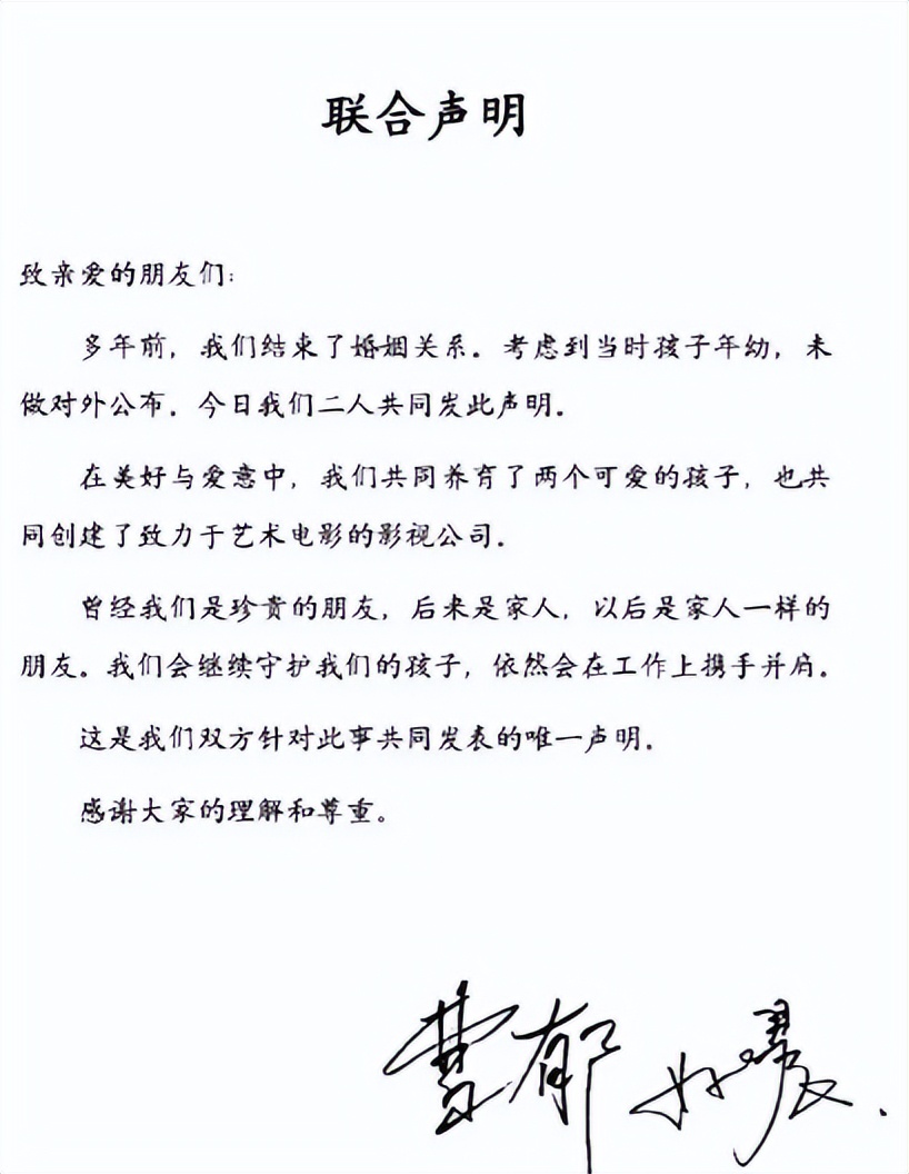 两人还在声明中强调,今后也会像家人一样继续共同照顾和抚养孩子。