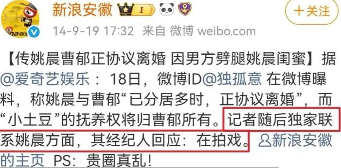 根据当时这个博主的说法,是老曹和姚晨的闺蜜好像有了一些不该有的“关系”,而且这个博主还在动态里说两人被姚晨给抓了个现行。
