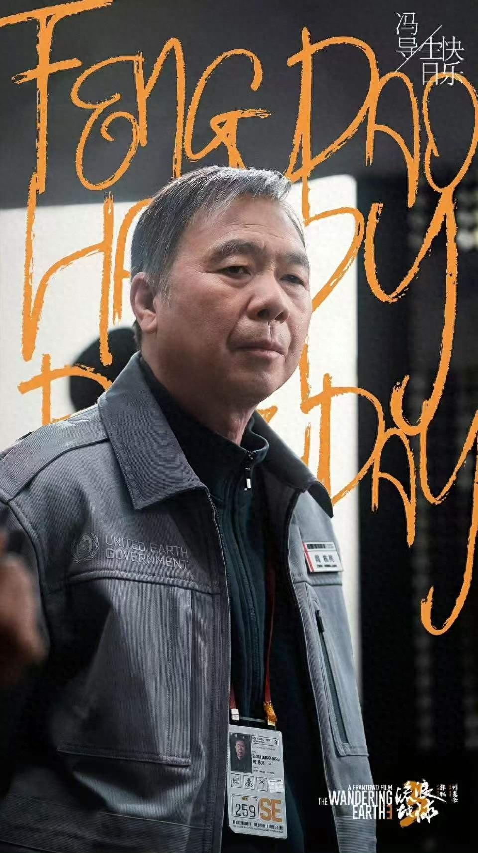 定妆照也一起放出来了。照片里冯小刚穿着地球联合政府那身深色制服,胸前工牌清清楚楚写着“周栋亮”,身份就是UEG的工作人员。头发灰白,眼神挺深沉,跟以前他当导演或者演胡同老炮儿的样子完全不一样,看着特别严肃。