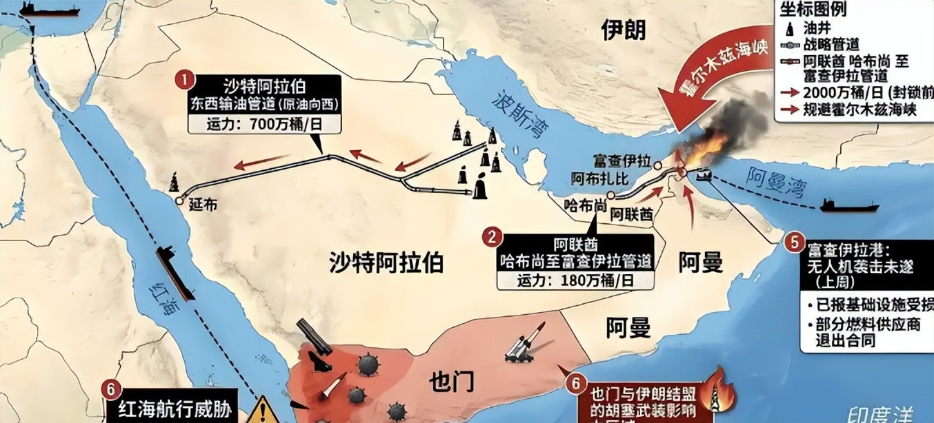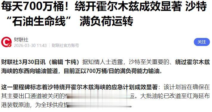以前沙特每天的总出口量大概是700万桶,现在光靠这条管道的出口,就差不多能顶上以前的大部分规模,相当于霍尔木兹海峡被封了,沙特不仅没亏,反而因为全球能源紧张、油价波动,赚得比以前还多。