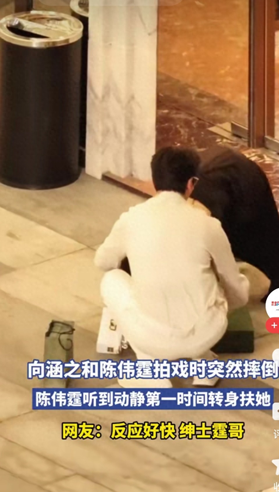 当天剧组在广州佛山取景,拍的是陈伟霆和向涵之的对手戏。谁也没料到,向涵之穿着修身衣服搭配高跟鞋,走步时被台阶绊了一下,结结实实摔在了地上,现场动静大得离五十米远都能听见。镜头刚好捕捉到陈伟霆的反应,他一回头发现身边的人没了,愣了足足一秒,那表情就像在说“人呢?刚才还在啊”。反应过来后,他立马和工作人员冲上去搀扶,全程没半点犹豫。