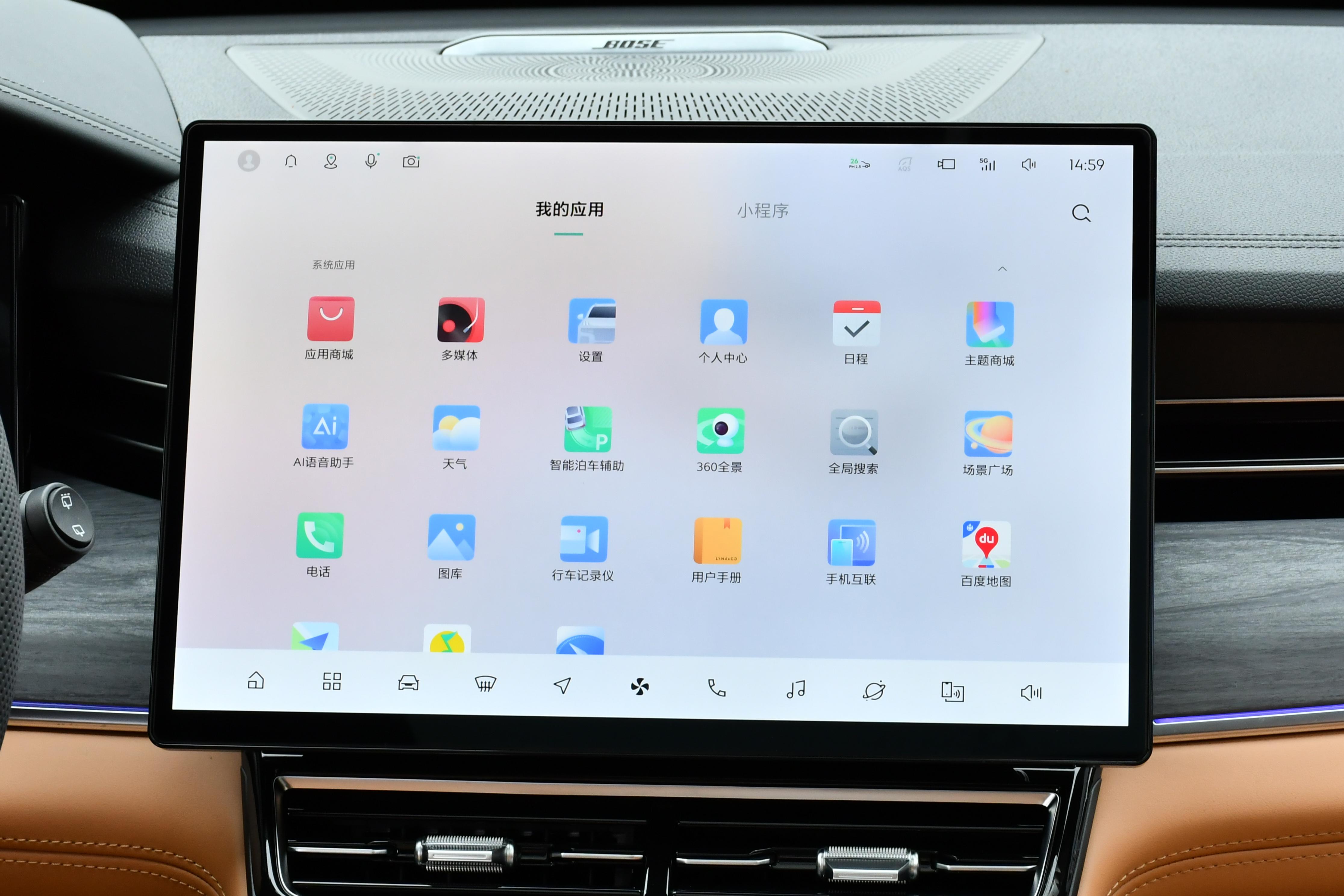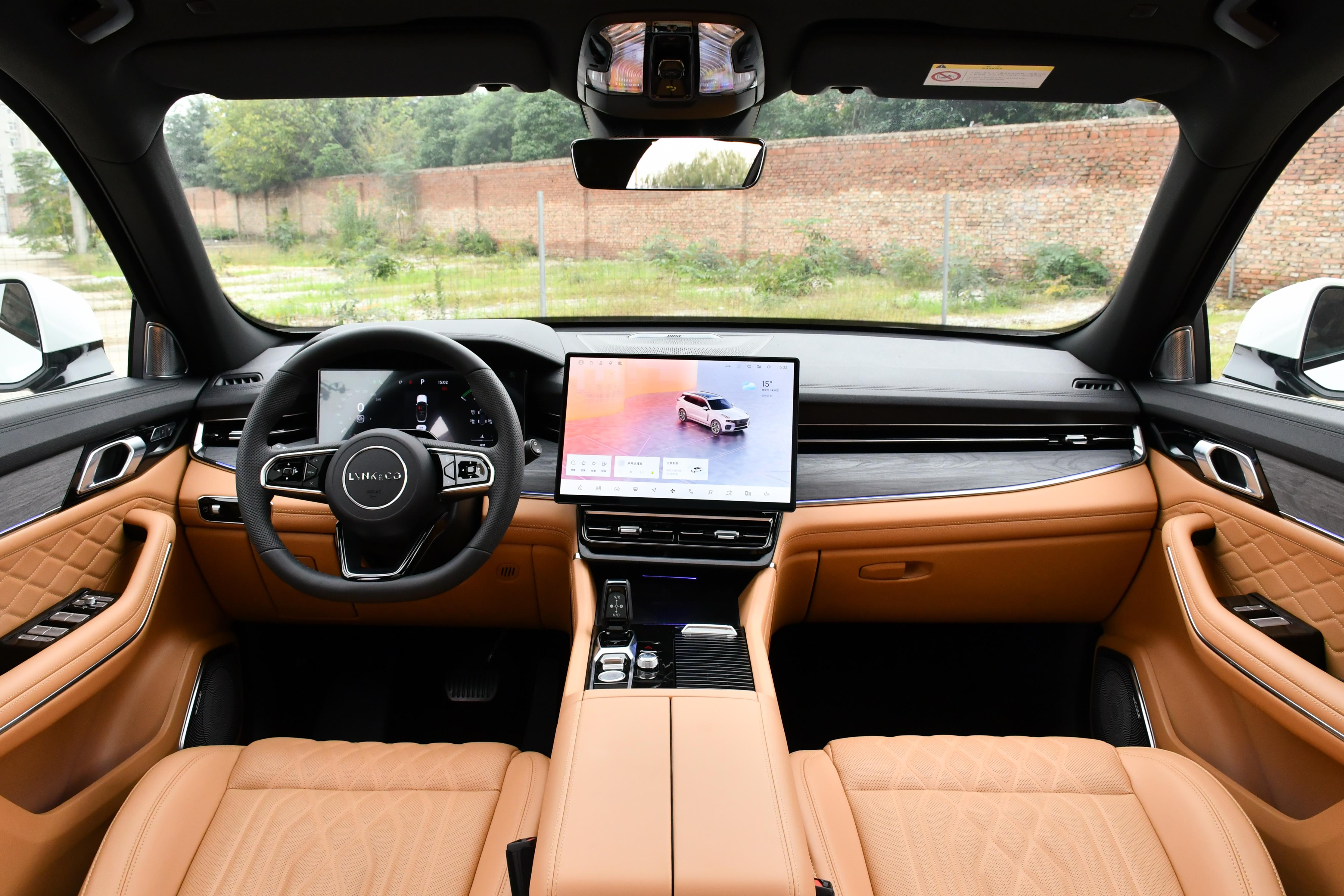 内饰部分,领克09采用的是环抱式的设计布局,并且中控台的角度偏向于驾驶室一侧,对于驾驶员的关怀度十分友好,棕色的内饰配色提升了一定的高级感,车厢内采用了大量的皮质包覆以及些许木纹装饰板,营造出比较强烈的豪华氛围感,三幅式的多功能方向盘造型时尚美观,采用的是真皮的材质,并带有记忆和加热功能,换挡形式为电子挡把,在前排中央扶手处还配备了手机无线充电功能以及2个USB/Type-C的多媒体接口,12.3英寸的全液晶仪表盘+12.8英寸的抬头显示系统(HUD)可以提供丰富的行车信息,中控台则搭载的是一块15.4英寸的2.5K液晶大屏,配备的是LYNK OS N车载智能系统,内置了高通骁龙8155车载智能芯片,智能化表现非常丰富,几乎目前主流的科技互联功能均有配备,另外,车内还搭载了14个BOSE品牌的扬声器,对于喜欢听音乐的朋友们来讲算是一个福音。