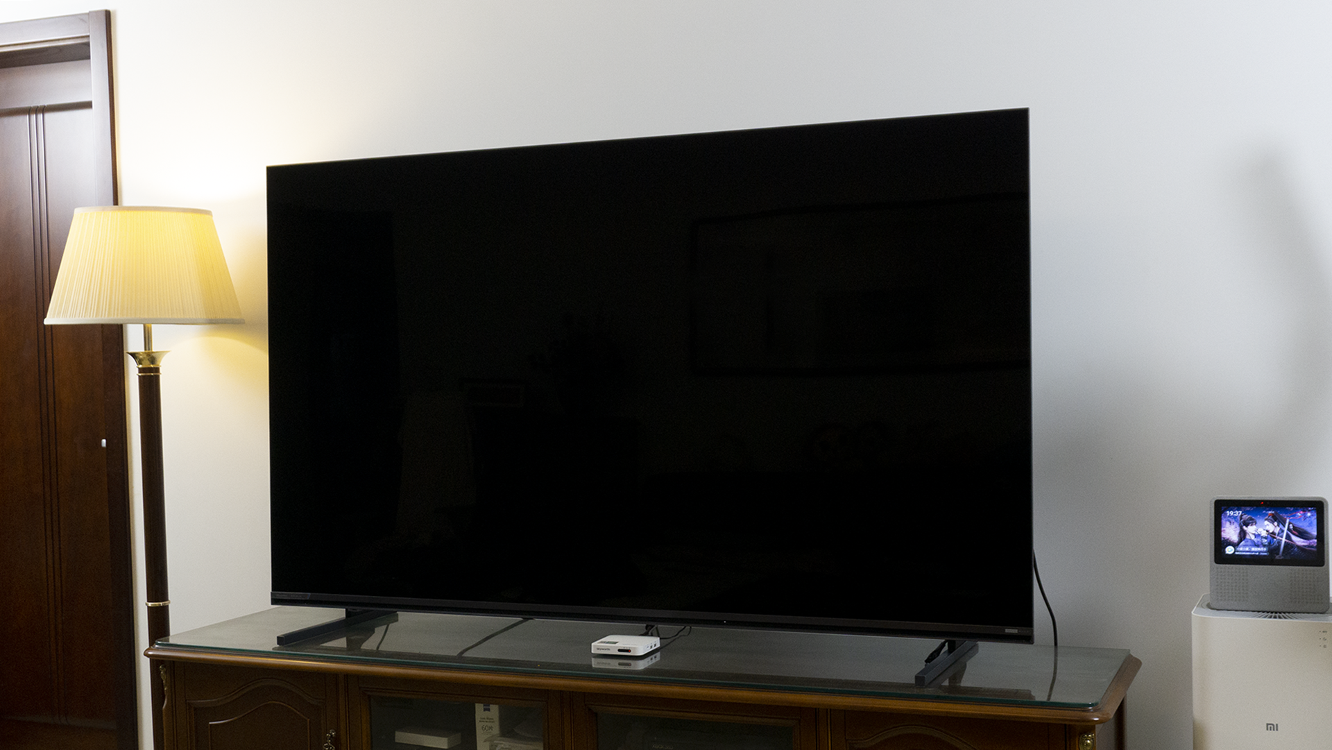 为此,我们也专门进行了一下测试。这是上午大约10点左右,室内斜射光线相对比较强的时候,以前的电视屏幕会反射出屋里的沙发、茶几之类的。但在这块黑曜屏 Pro之上,几乎看不到家具的影子。