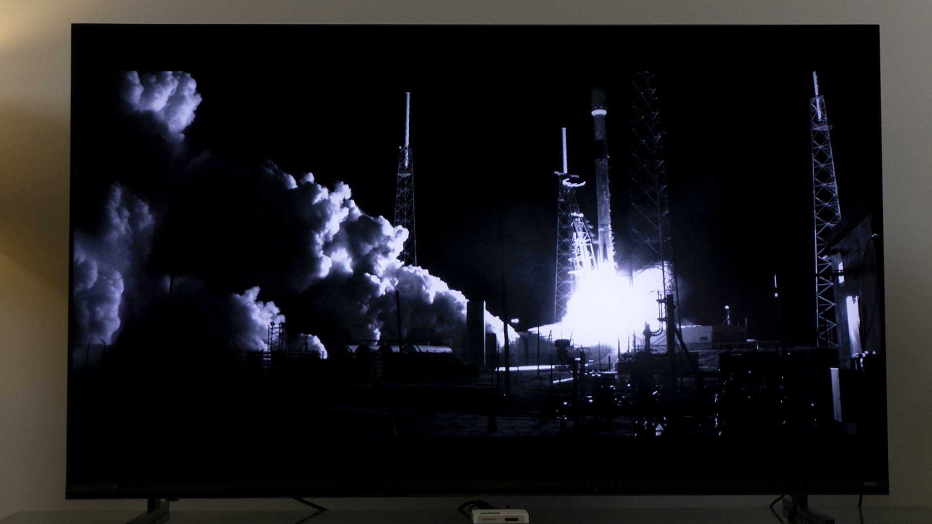分区背光越多,就意味着画面的显示效果越精细,我们再次选择黑白画面来观察。比如说,眼前黑白色烟雾的画面,更多的分区就会以更精细的光线去追踪运动的火箭和烟雾,黑与白之间边缘清晰,过渡干脆,没有那种虚影和发灰的干扰部分,整体的感觉也更为纯净。