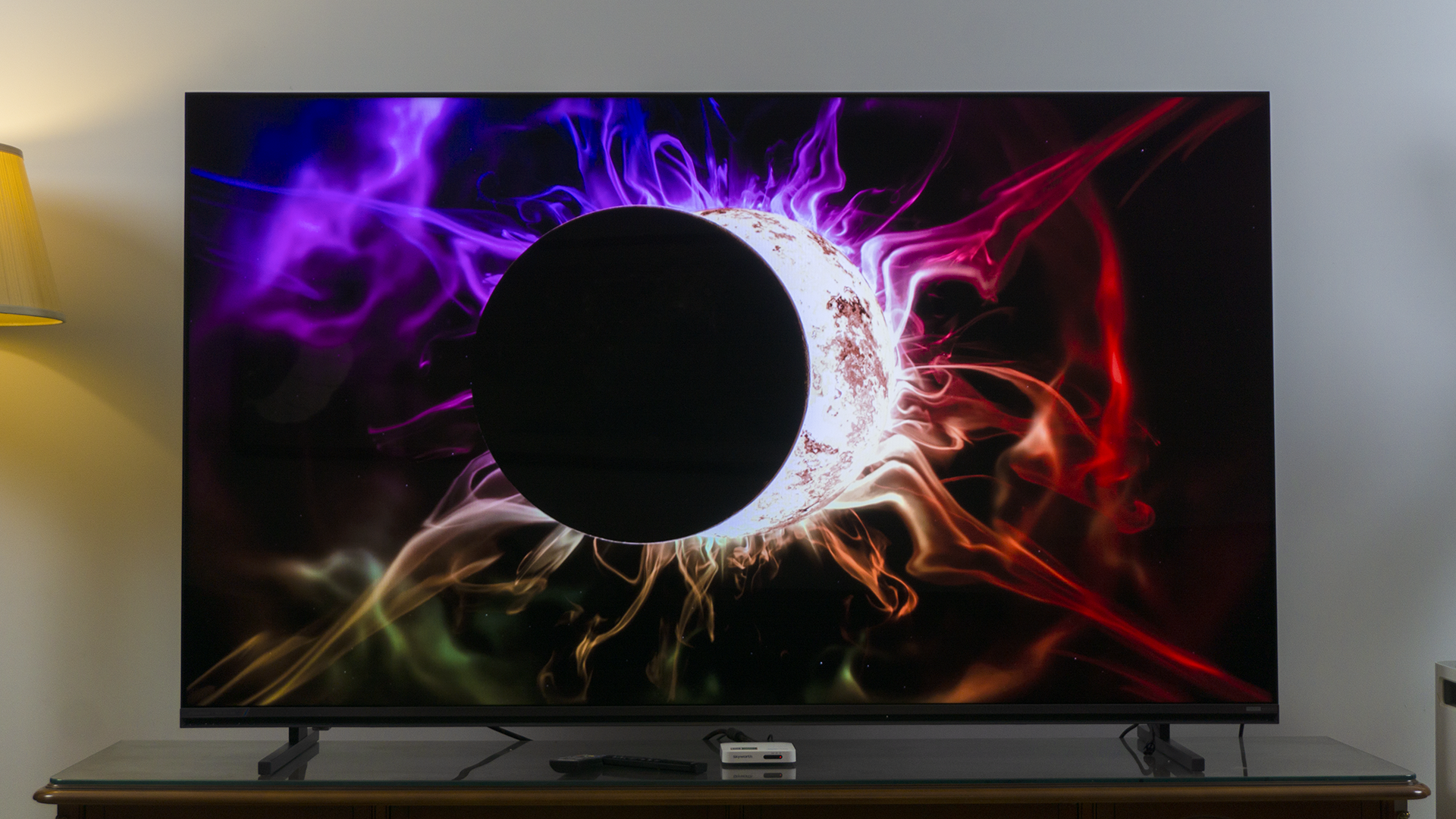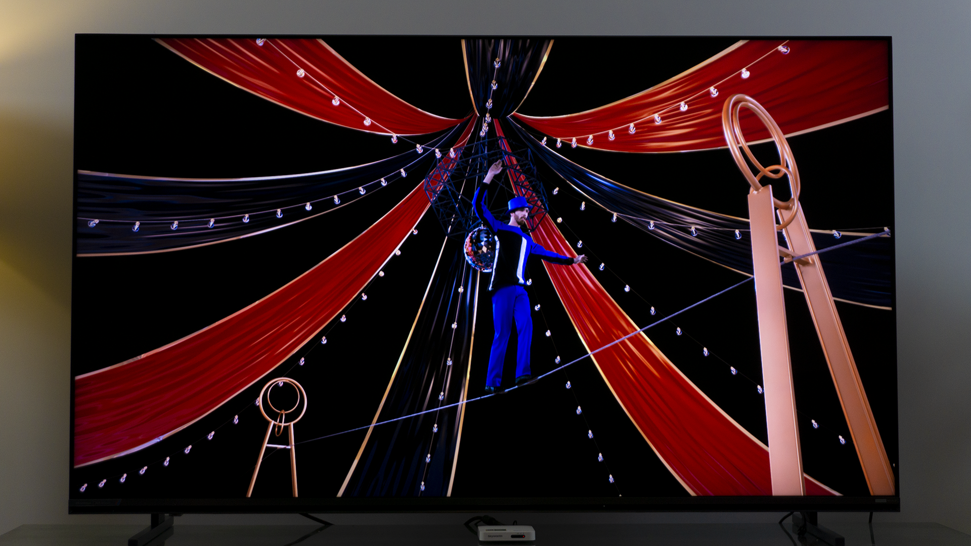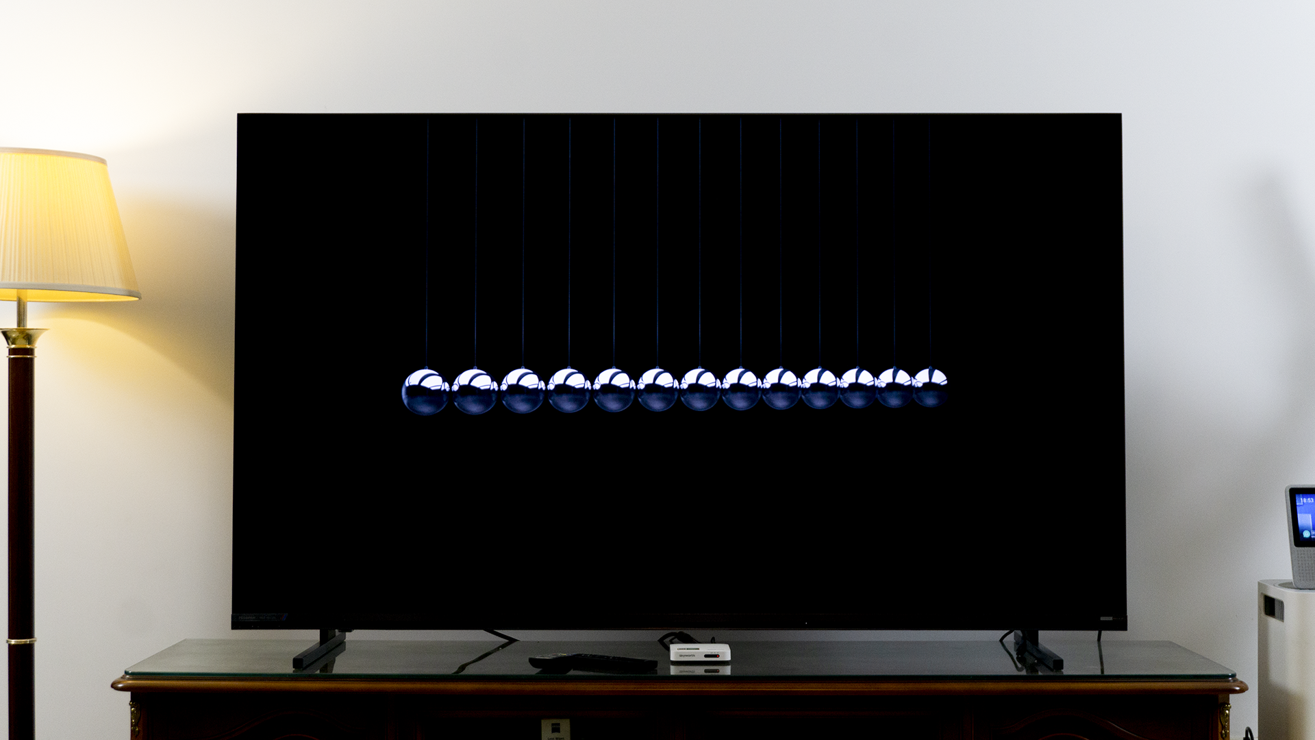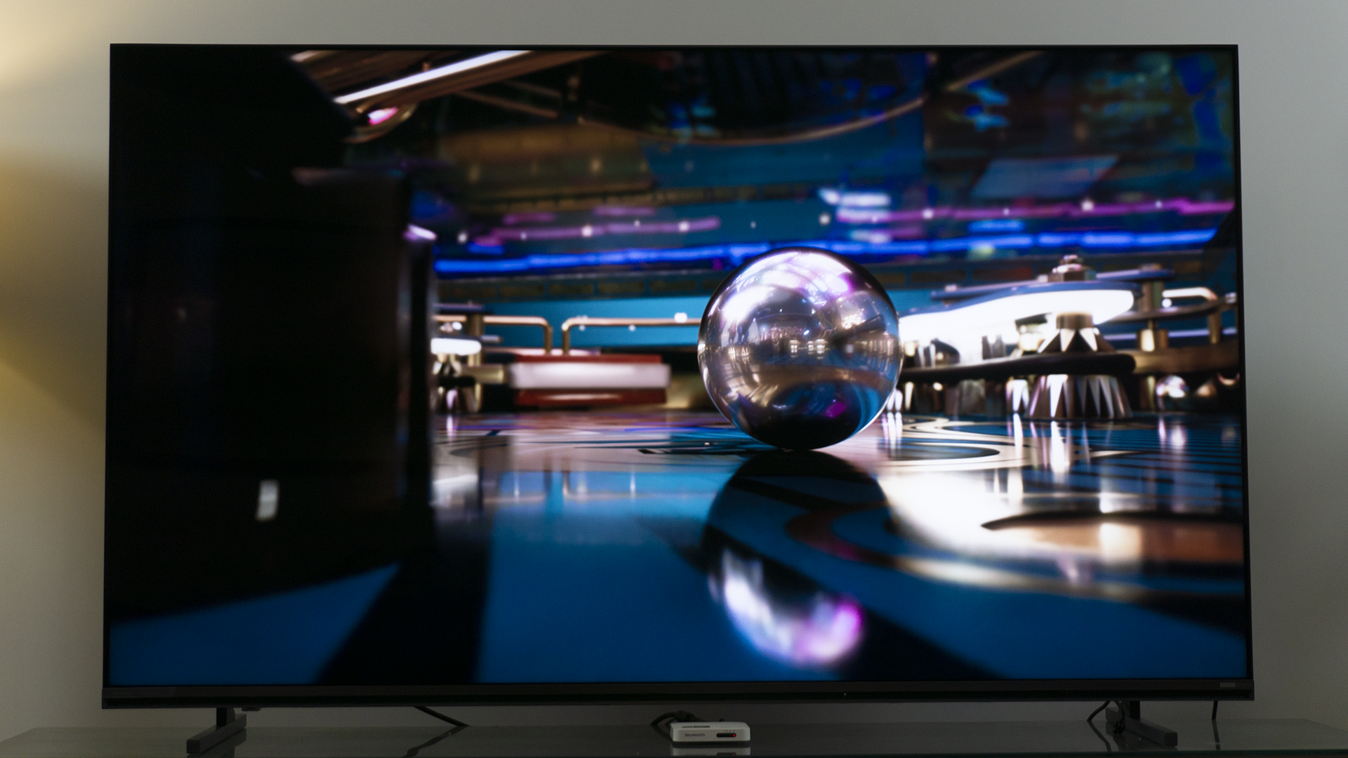如果说,过多的色彩会影响我们对一台电视基本显示效果判断的话,我们不妨再来看一下,这段演示影片。它的色彩非常纯净,考验的是一台电视是不是能够处理好背光外溢的情况。通过上面的照片,我们可以清晰地看到,被高光打亮牛顿摆球体边缘,依旧是漆黑的。并没有因为球体的高亮而“染色”,或是出现白色的光晕。而这与海信E7S Pro的3888的分区背光直接相关,更细致的分区,可以让画面的每一个细节都有自己的“灯光师”,该亮的亮、该暗的暗,丝毫不含糊。