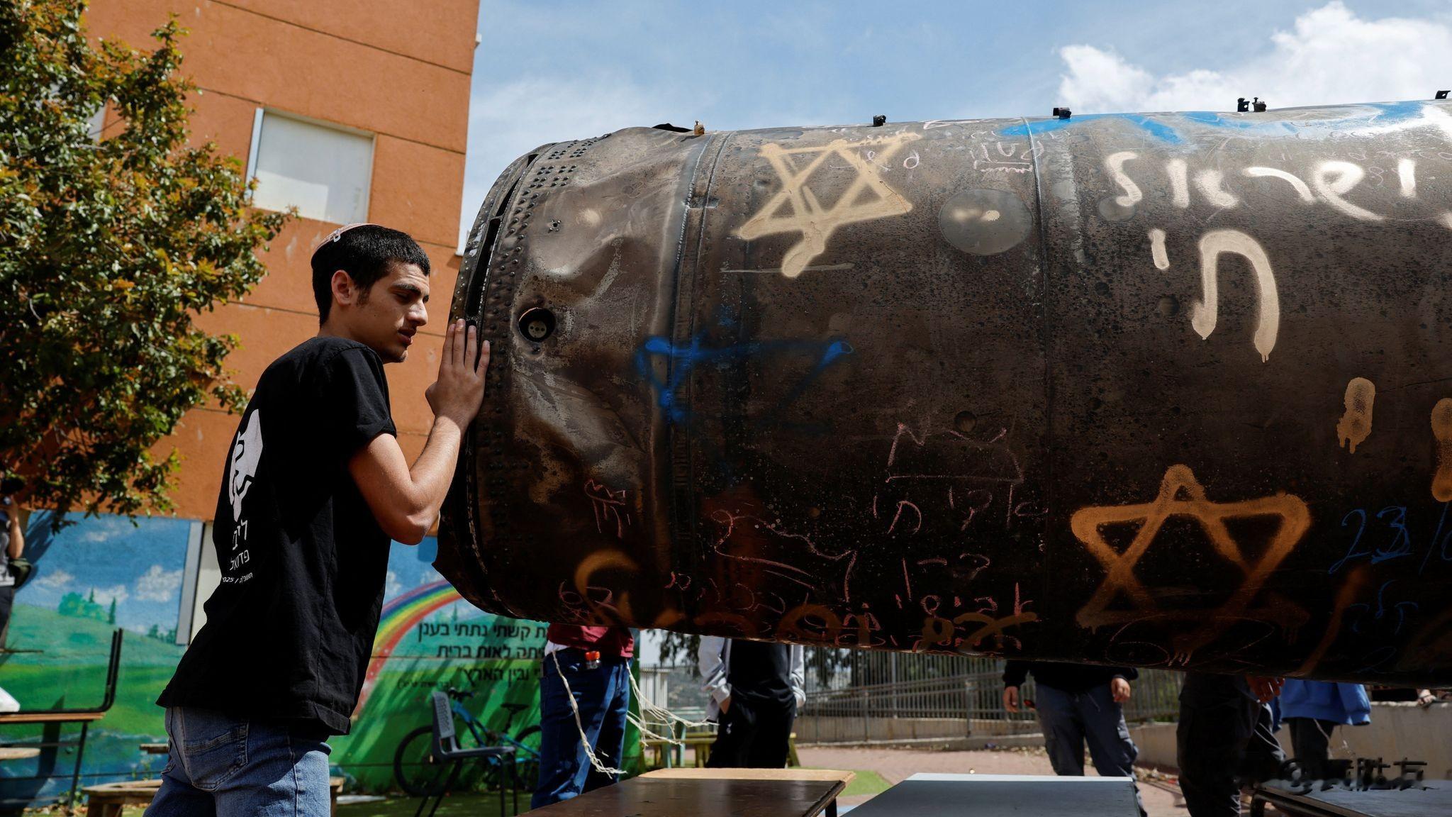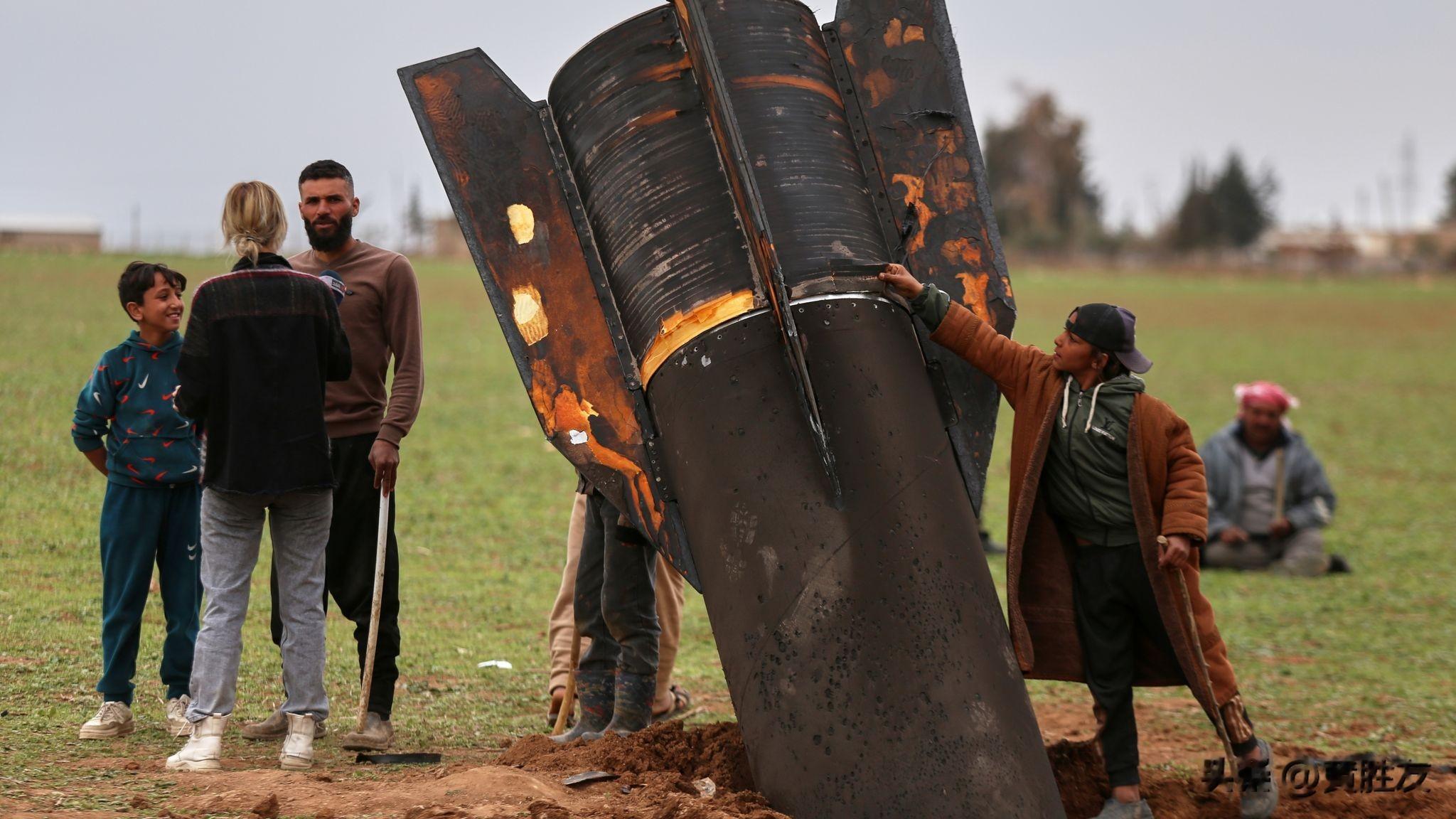 孩子们在导弹残骸周围玩耍,这些镜头是中东各地可见的导弹的残骸。