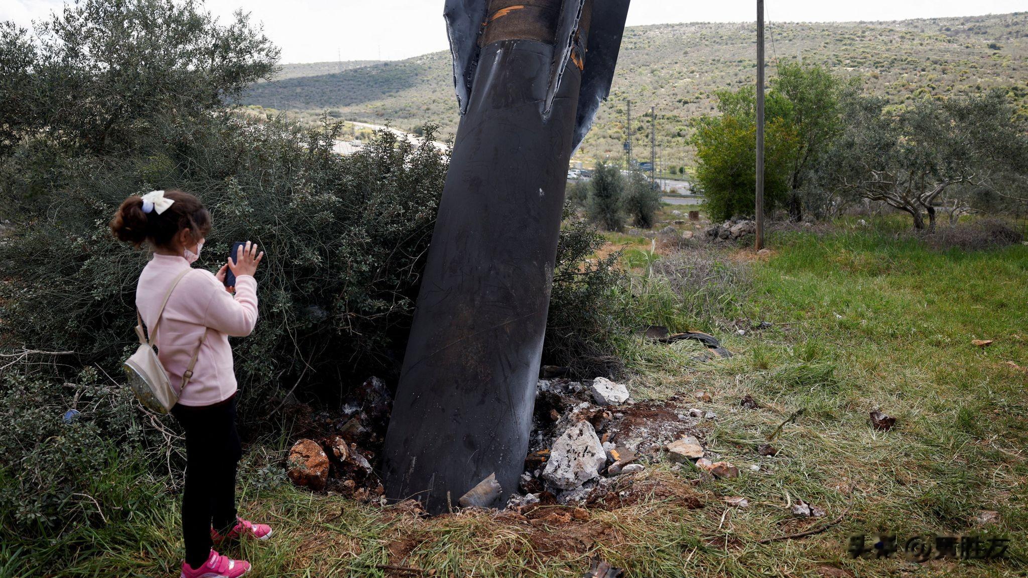 3月24日(周二),有照片显示,一名女孩在约旦河西岸的以色列定居点一个村庄里,站在一枚导弹旁摆姿势拍照——导弹的尾翼从地面探出。