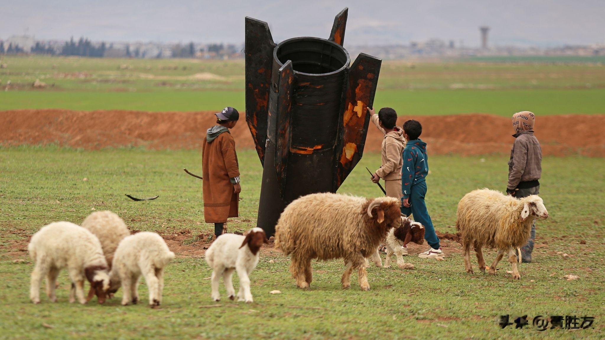 本月早些时候,叙利亚东部的牧羊男孩们似乎没有意识到潜在的危险,有人拍到他们站在一枚未爆炸的导弹旁,这枚导弹落在了卡米什利郊外的一片开阔田野里。