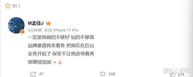 3月20日,孟佳在个人社交平台发文称:自己受品牌邀约看秀,结果被忘在后台,走秀已经开始,结果保安不让进场看秀,孟佳还自嘲是自己不够好,站的不够高,并表明自己要好好加油。发文一出引发一波争议,网友纷纷猜测是哪个品牌,居然有如此操作。但也纷纷在评论区安慰孟佳,不要自责,根本不是她的问题。