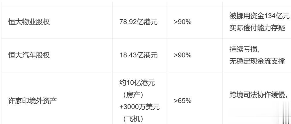 恒大物业、恒大汽车等核心资产仍处尽调与谈判阶段,无实质成交;许家印家族全球资产(加拿大、新加坡、泽西岛等)追缴依赖司法协作,单笔房产处置周期超24个月;境内500余亿元确认债权仅完成审查,分配方案尚未形成。