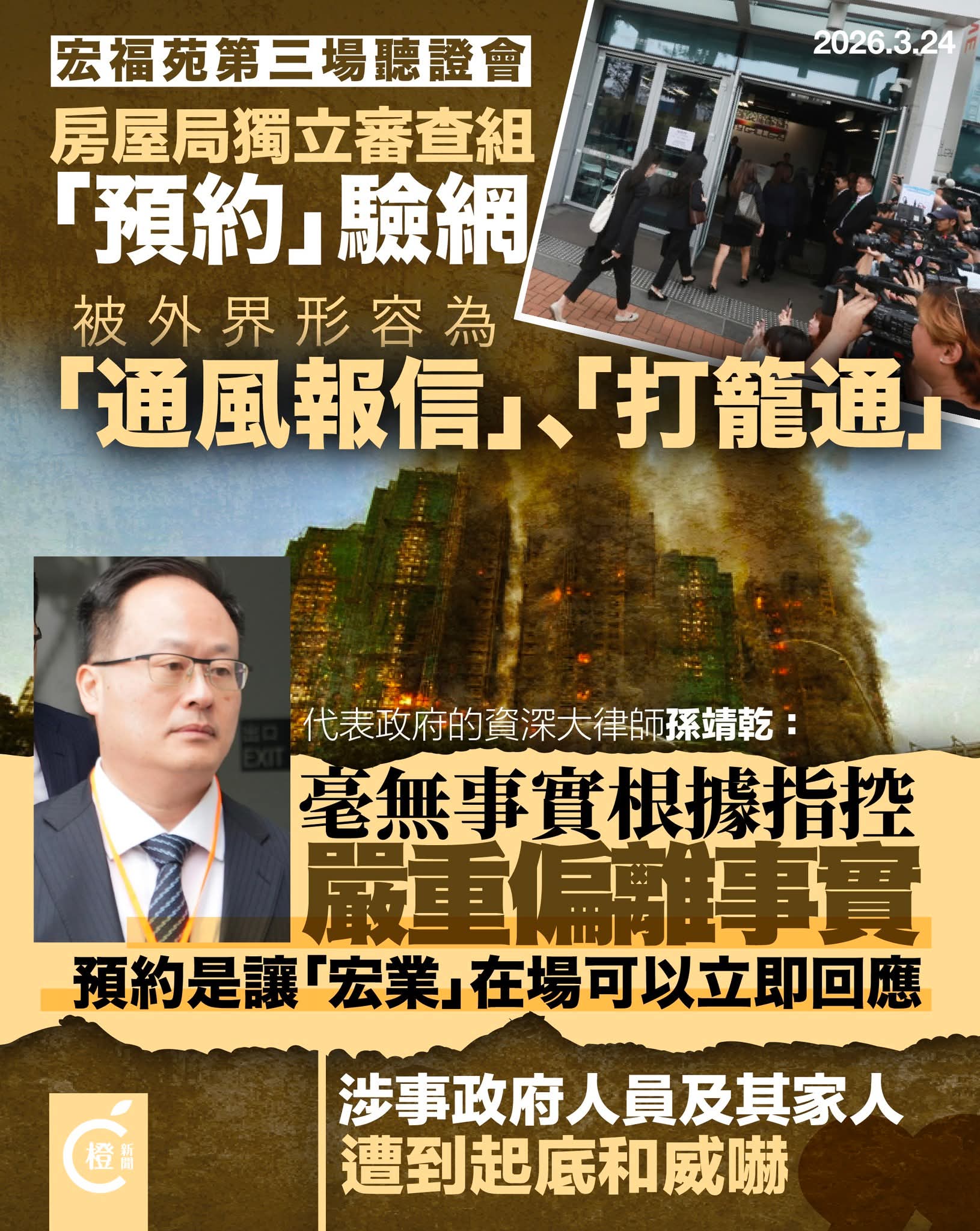 2025年11月26日,大埔宏福苑发生五级大火,168条宝贵生命就此逝去,这场悲剧始终牵动着全港市民的心。为彻查火灾成因、厘清监管责任、堵塞制度漏洞,政府委任的独立调查委员会自2026年3月19日起举行公开听证会,3月24日召开的第三场听证会上,代表特区政府的资深大律师孙靖乾发表开场陈词,围绕调查精神与方向、消防及警务处应变行动、维修工程框架、大火成因、即时措施与未来改革五大范畴,全面阐明立场。作为普通市民,我们既期待尽早得知真相,更需保持理性客观,避免在证据未完全呈现前妄下结论。