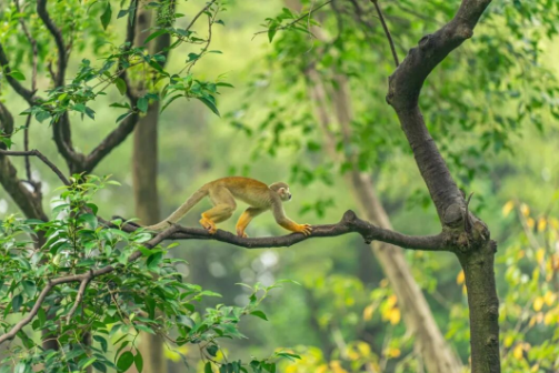 灵长类展区内,饲养员将食物藏入打孔椰壳、编织网袋,悬挂在树枝间打造“森林食堂”,让金丝猴、长臂猿在踮脚够取、抠取觅食的过程中,还原野外生存的自然行为。
