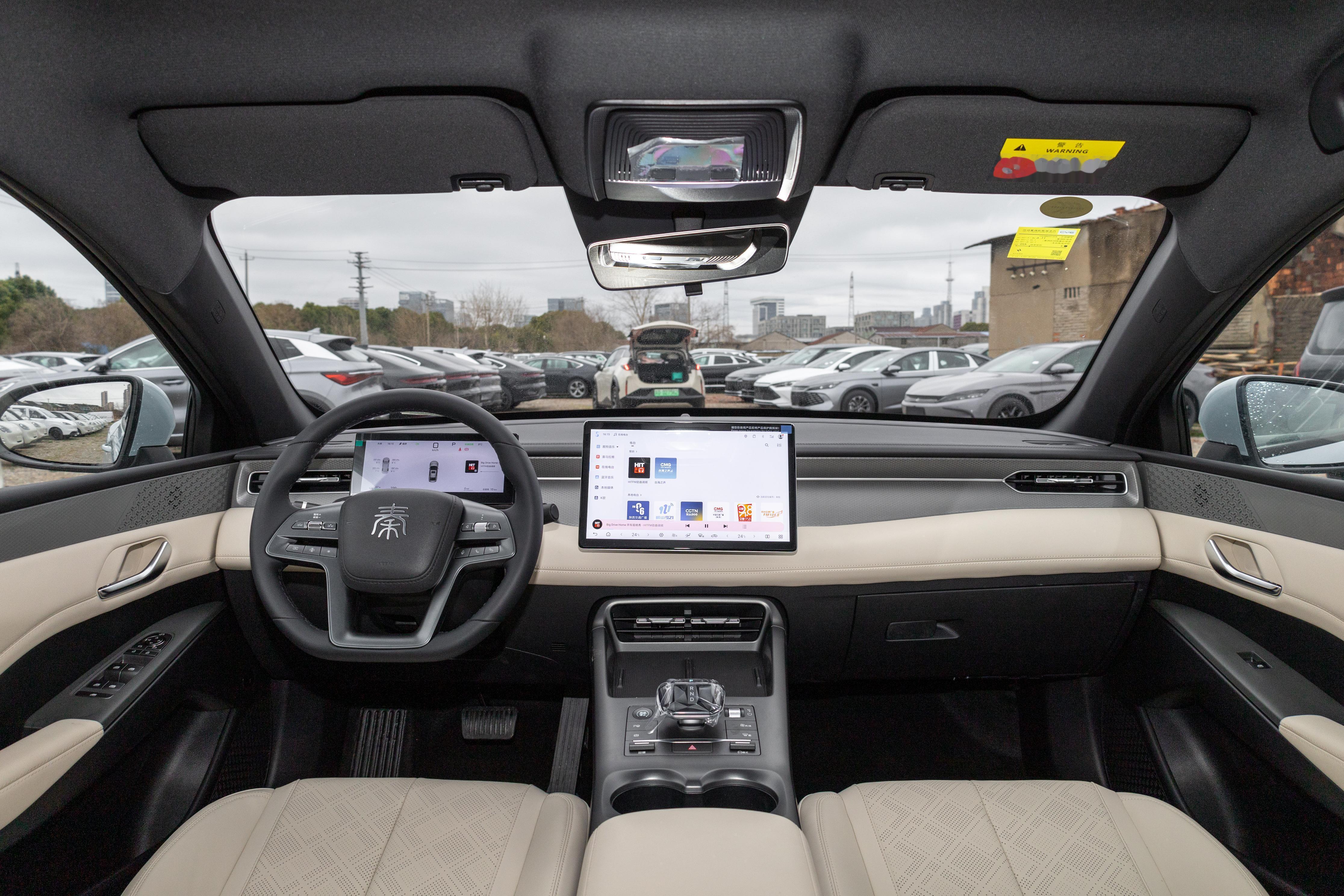 秦PLUS EV的内饰采用的是环抱式的设计布局,双拼色的内饰配色提升了一定的高级感,车内同样采用了大量的皮质包覆,8.8英寸的全液晶仪表盘+12.8英寸的中控屏属于常规的组合方式,配备的是DiLink车载智能系统,内置了D100车载智能芯片,支持手机App远程控制、百度地图导航、蓝牙/车载电话、车联网、OTA升级、语音识别控制系统、Wi-Fi热点以及应用商店等功能,虽然缺少了手机互联映射功能,但是这套系统的语音识别功能比较好用,支持多地方的方言识别,不仅识别率较高,而且响应速度比较快,能够提升日常驾驶的便利性。四幅式的多功能方向盘大小适中,采用的是皮质的材质,手感还算细腻,换挡形式为电子挡把,并在挡把周围设置了一些操作方面的实体按键,用起来比较顺手。