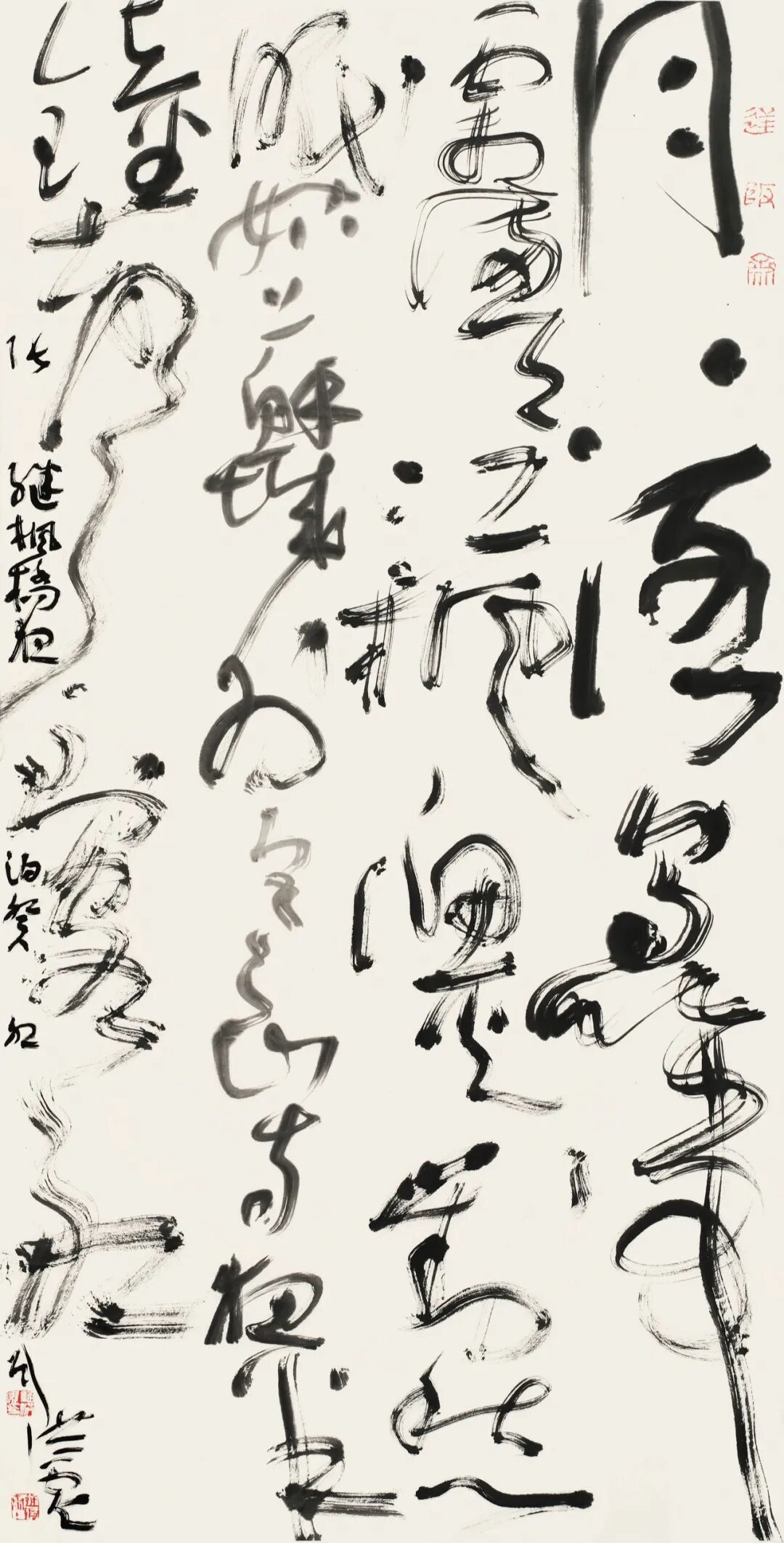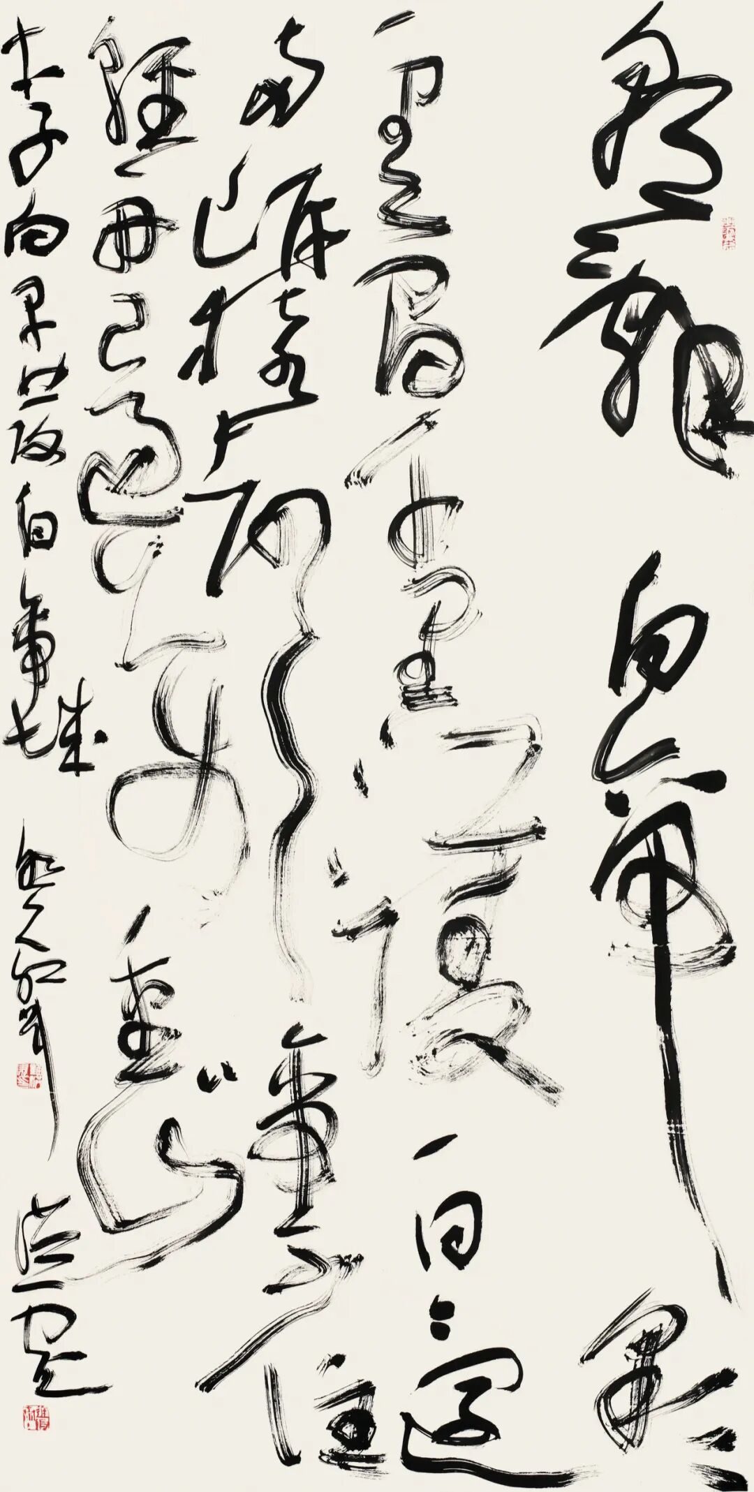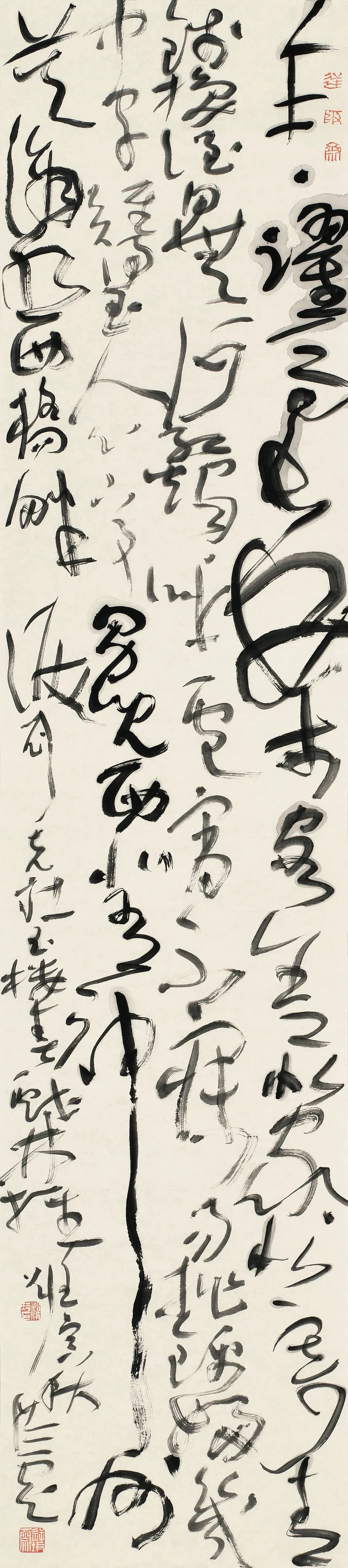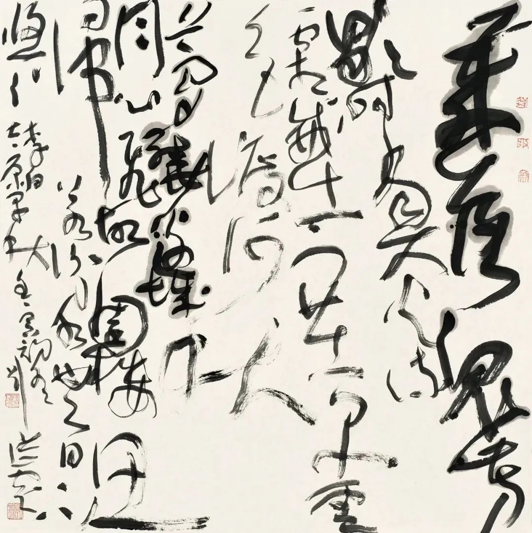 结体上,他打破传统草书“对称均衡”的固化范式,主张“结体无定形,顺势而为”。根据章法与情感需求,灵活调整字形大小、疏密、欹正,不刻意规整却严守草法规范,实现“法中有变、变中合法”,形成错落有致、虚实相生的独特风貌。