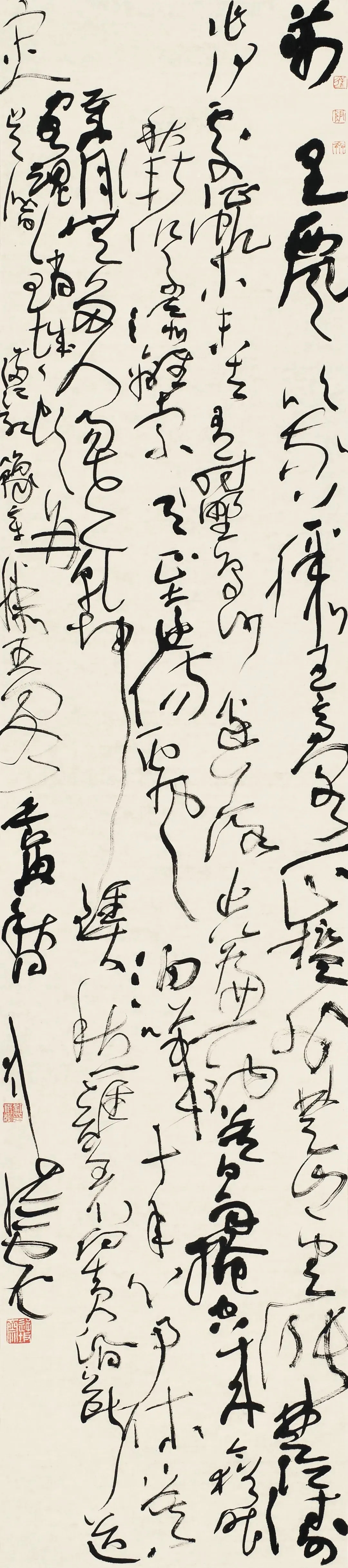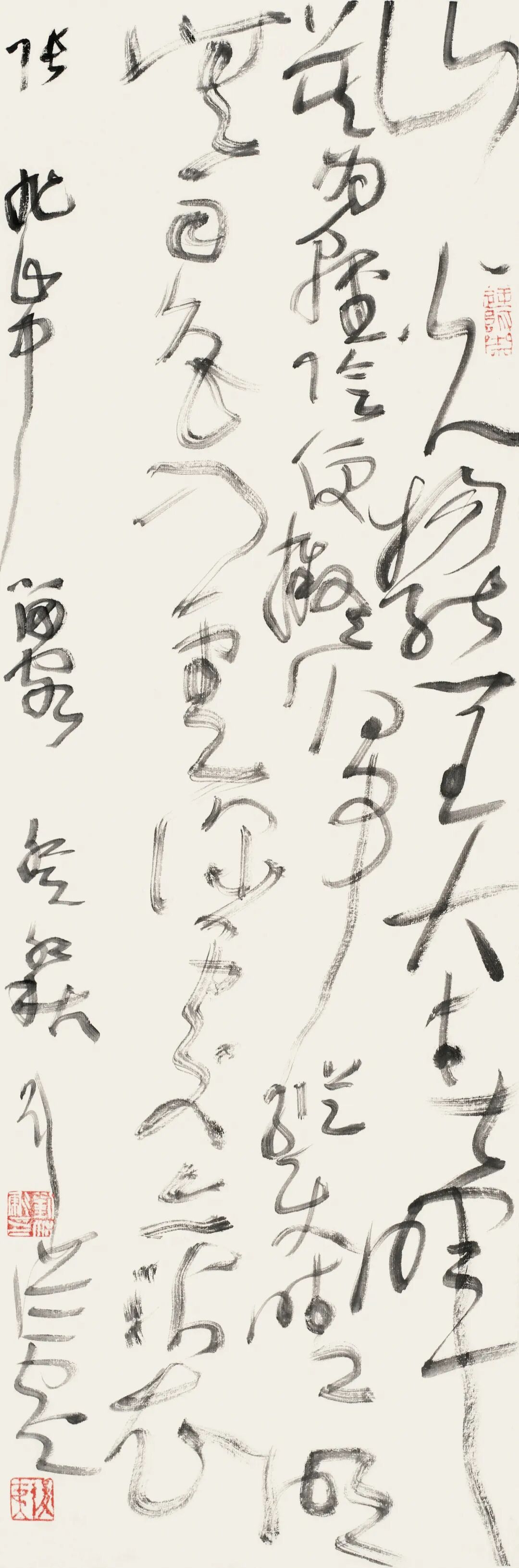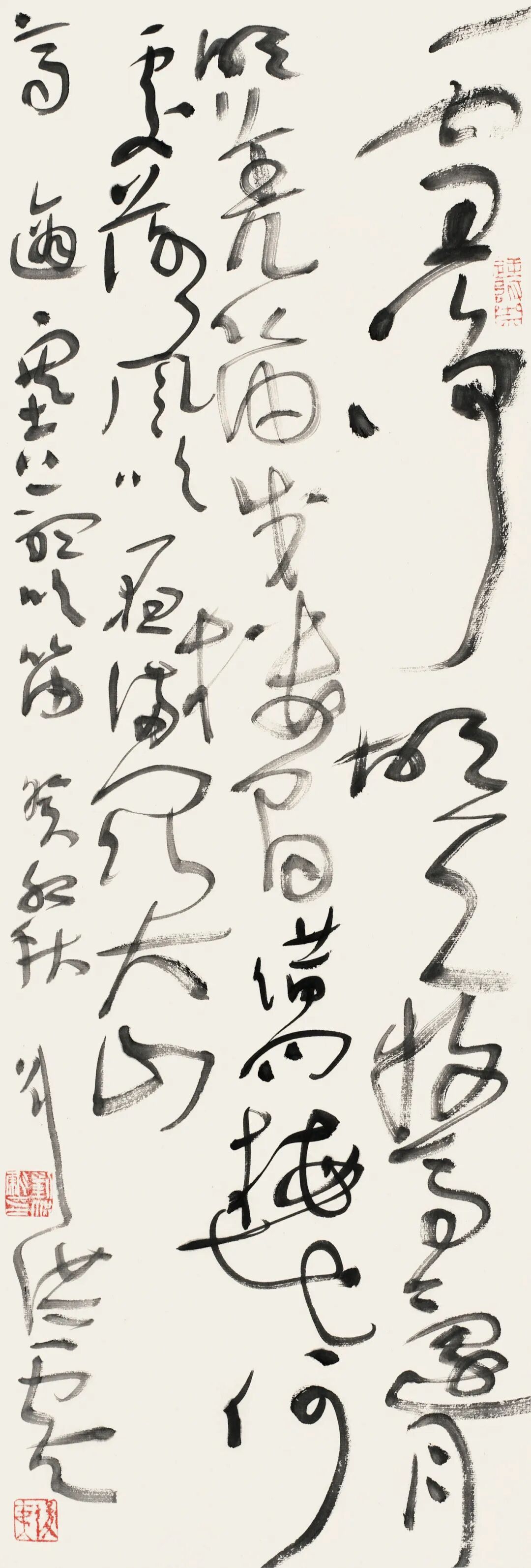 结体上,他打破传统草书“对称均衡”的固化范式,主张“结体无定形,顺势而为”。根据章法与情感需求,灵活调整字形大小、疏密、欹正,不刻意规整却严守草法规范,实现“法中有变、变中合法”,形成错落有致、虚实相生的独特风貌。