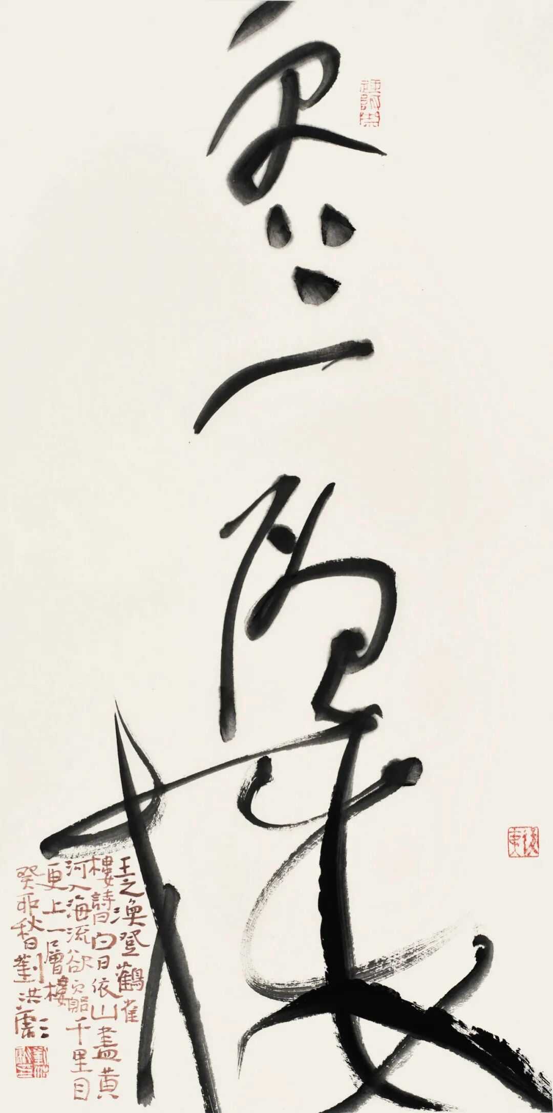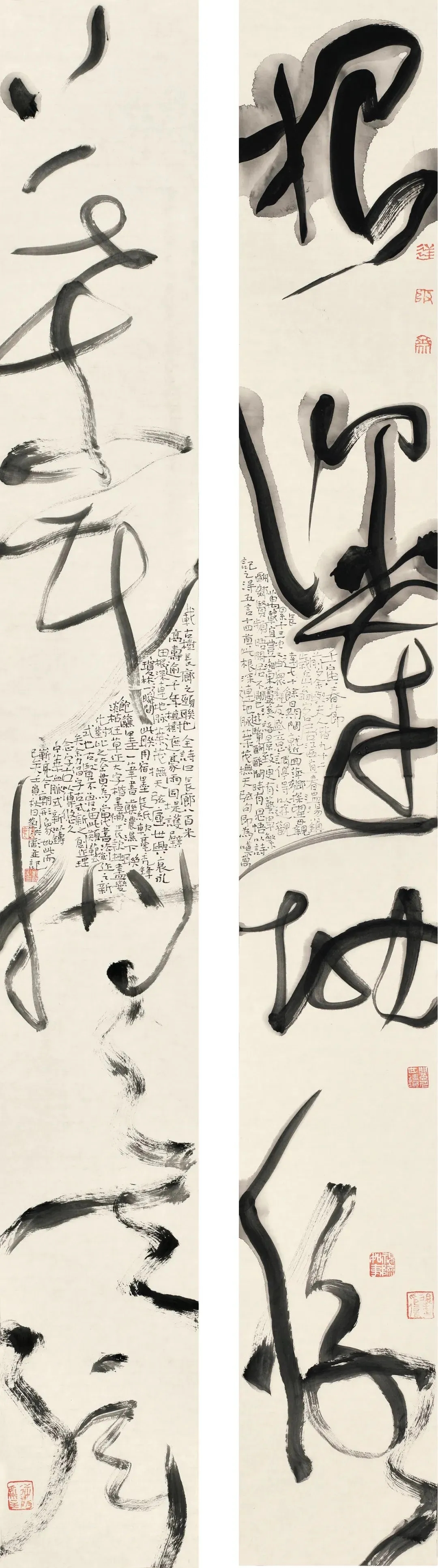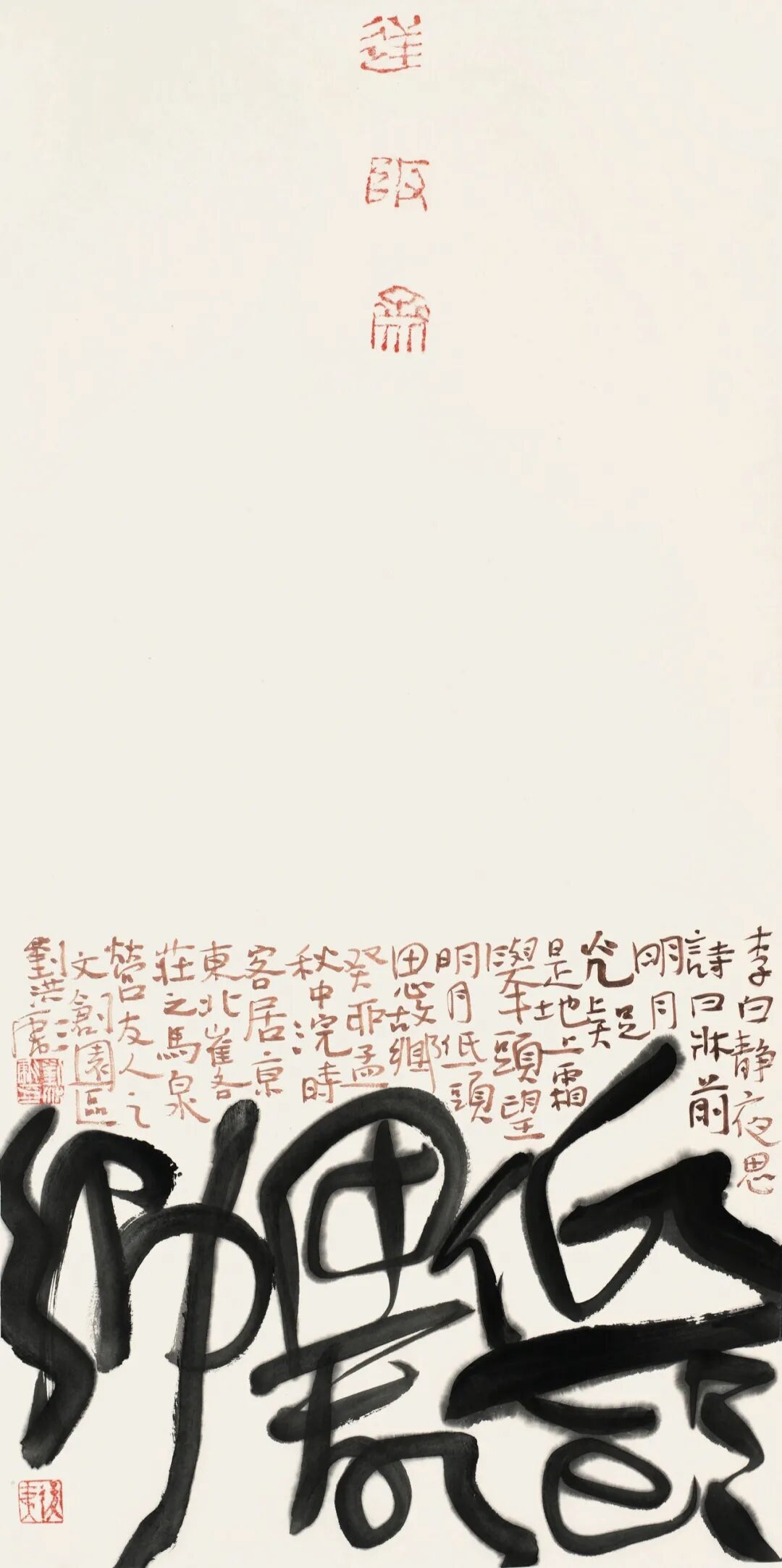 章法上,他首创“三维布白”理念,跳出“纵有行、横有列”的传统束缚,以现代设计思维重构空间经营。通过字距行距的灵活调整,让字形如山川起伏、城市天际线般疏密变化,气脉贯通;同时运用大小参差的书体小块面穿插、闲章点缀等手法,强化视觉冲击力,成为书坛效仿的范式 。