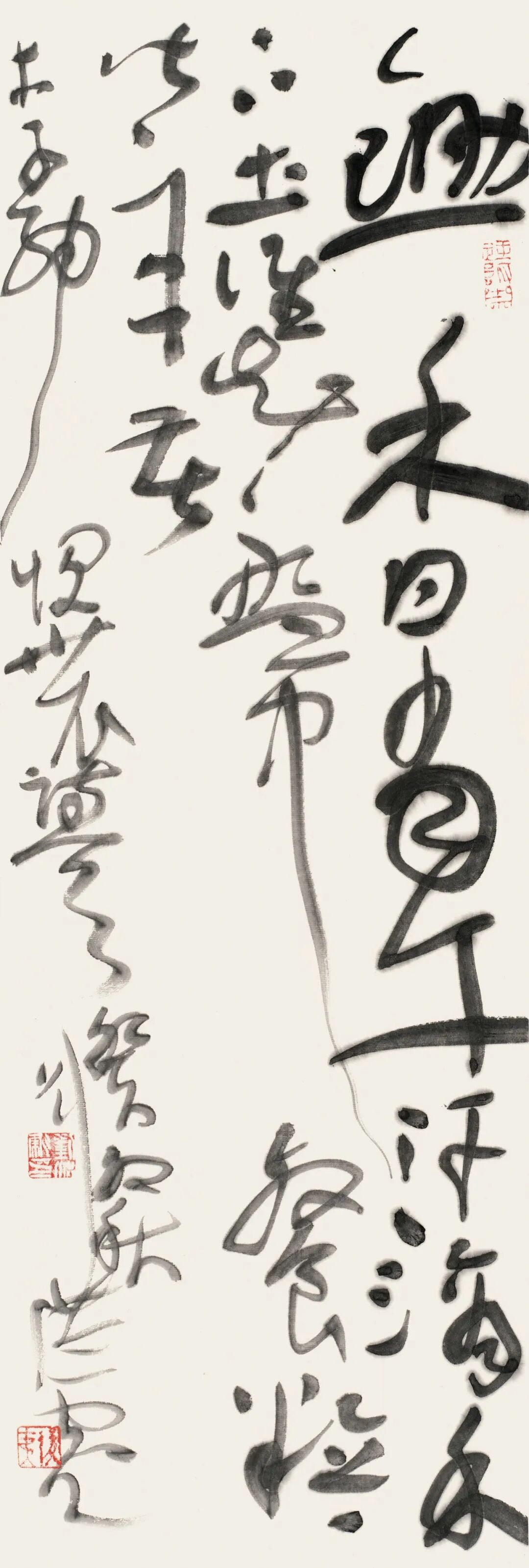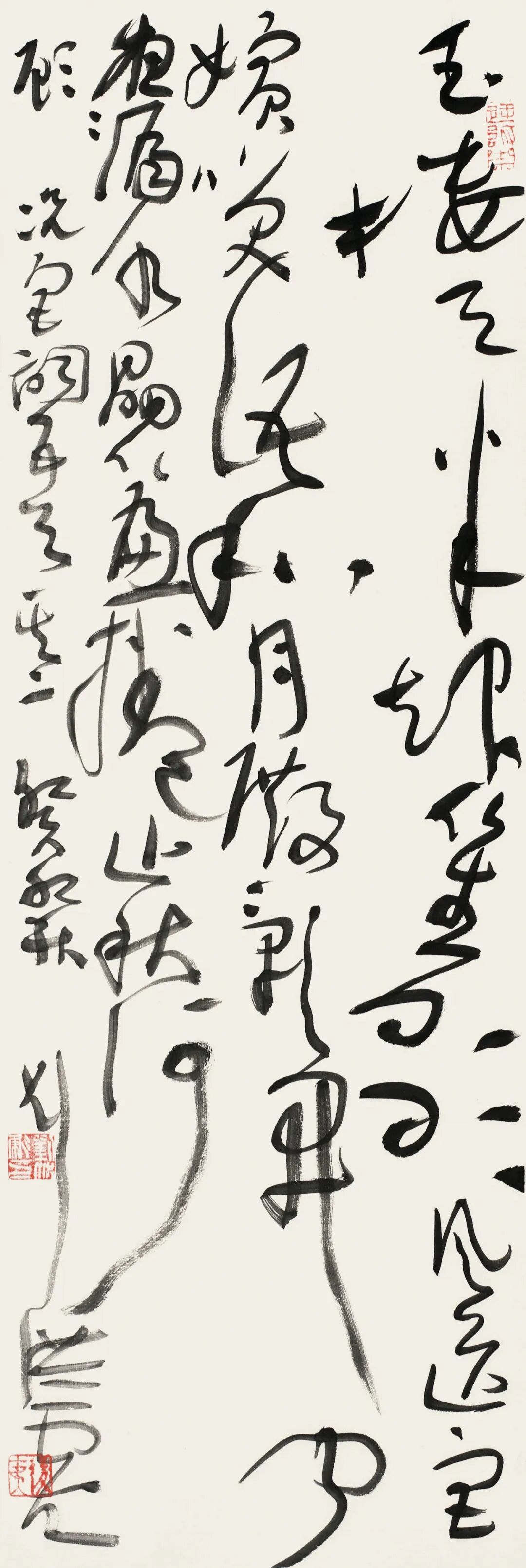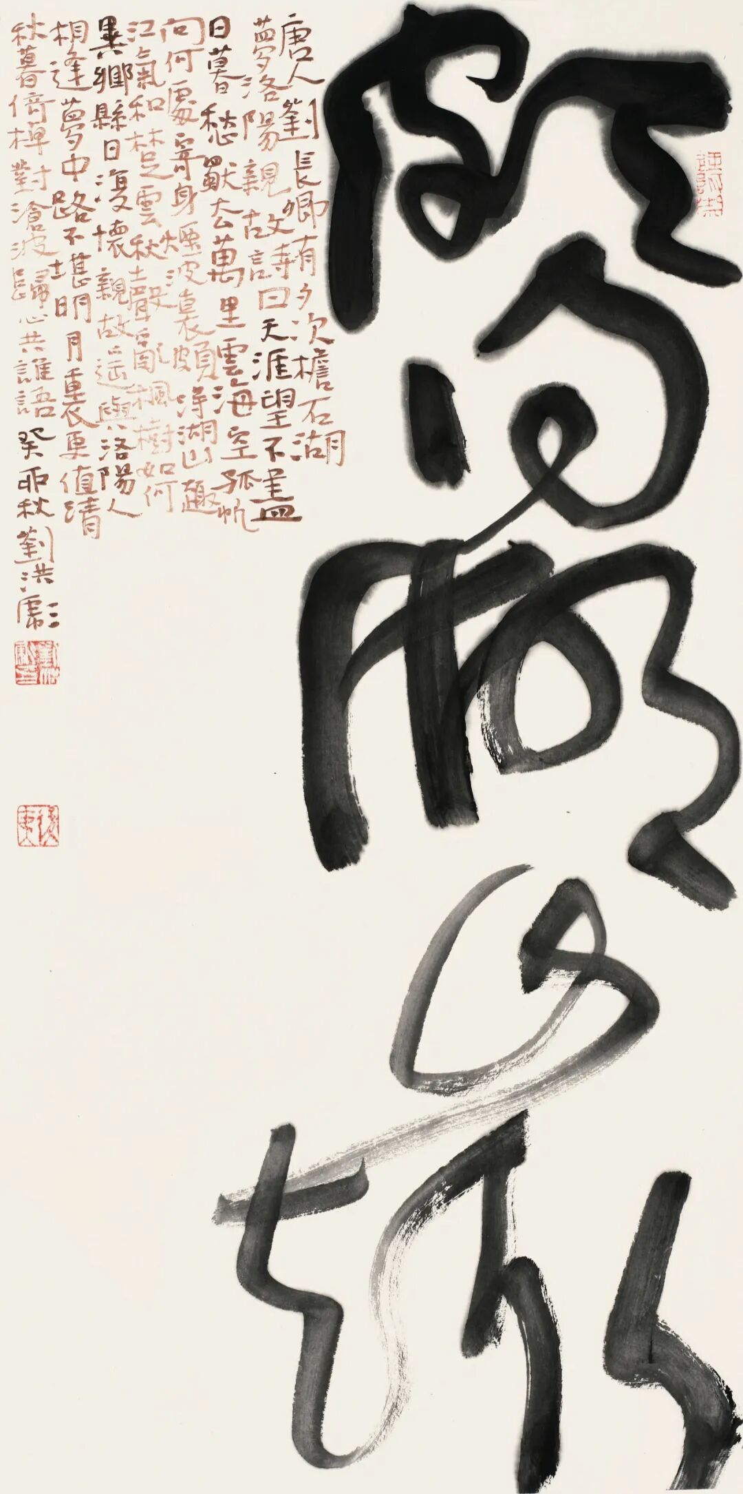 刘洪彪的草书核心特质,是理性调控下的感性书写——既严守草书法度,又率性抒怀,实现对立统一的艺术境界。他主张“辩证法是书法的最高法”,在浓与淡、枯与润、疏与密、刚与柔的矛盾碰撞中,构建出极具张力的视觉语言。