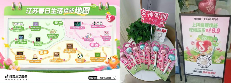 从「美美焕新」出发,联动南京、无锡、常州3城30+家本地变美焕新标杆商家打造「女神焕新地图」,推出按摩足浴、汤泉spa、美容瘦身等多款品类优惠活动,以超值套餐满足消费者的变美体验。线下同步铺设专属扫码物料,高效承接线上流量,打通从种草到消费的完整链路,实现流量聚合与交易转化的高效闭环。