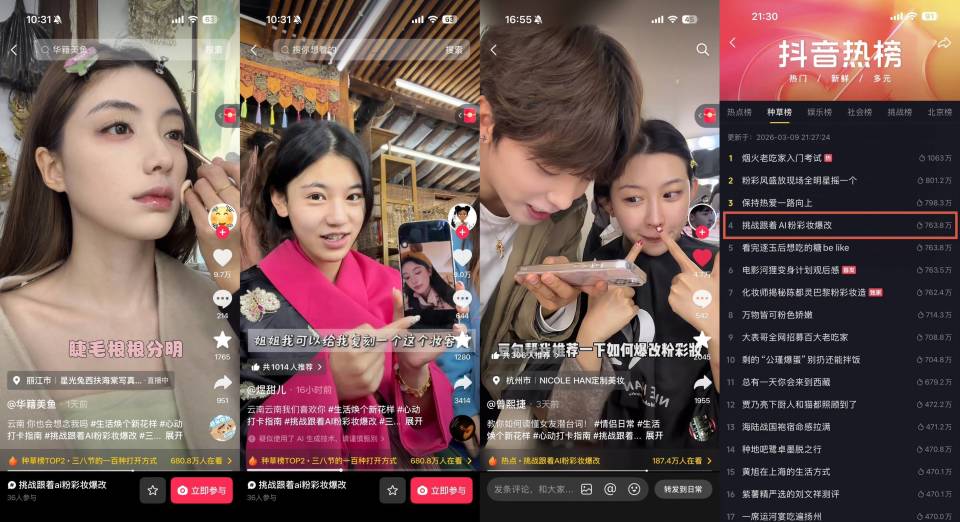 紧跟抖音春日彩妆趋势,深度结合豆包AI的粉彩妆爆改思路与线下到店体验场景,打造彩妆热点 #挑战跟着AI粉彩妆爆改,用年轻化、科技感的新潮玩法激发用户的线下体验热情,带动平台优质内容持续产出。话题 #挑战跟着AI粉彩妆爆改 登上全国榜TOP13、种草榜TOP4,话题在榜热度值763.8万+,实现了线上种草与线下消费体验的闭环。
