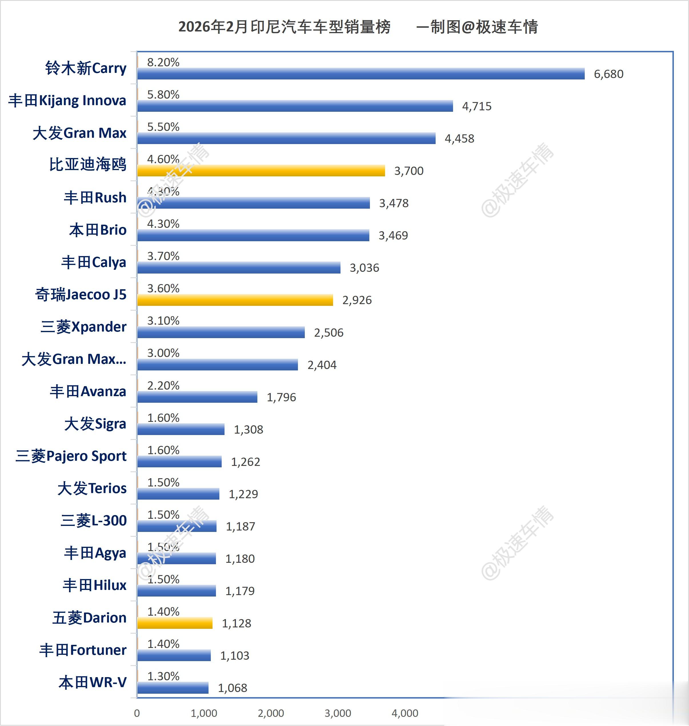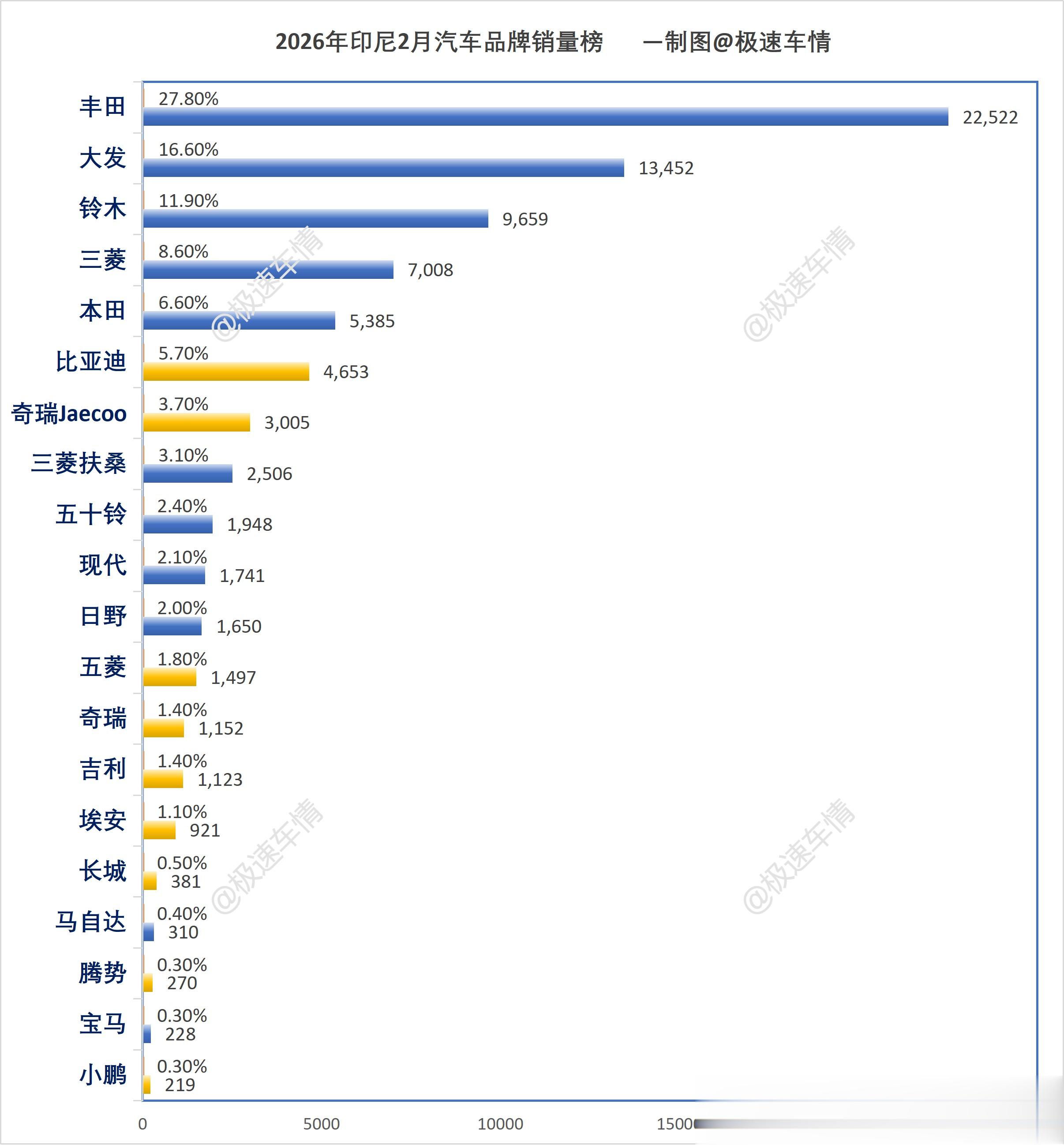 大家好,这里是极速车情。今天为大家带来印尼汽车市场2026年2月的销量数据报告。