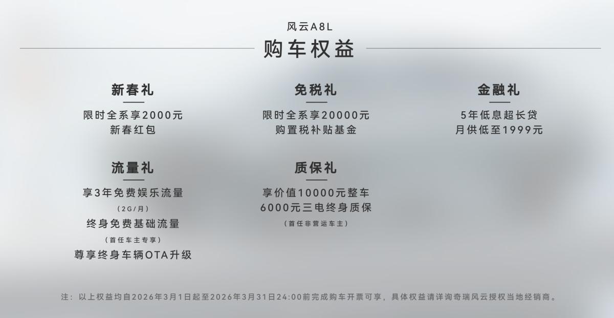 现在购车不仅可以享受全面升级的OTA功能,还能享受多重购车权益,其中包括限时全系享2000元新春红包;限时全系享20000元购置税补贴基金;5年低息超长贷,月供低至1999元;享3年免费娱乐流量(2G/月)+终身免费基础流量(首任车主专享);享价值10000元整车+6000元三电终身质保(首任非营运车主)。