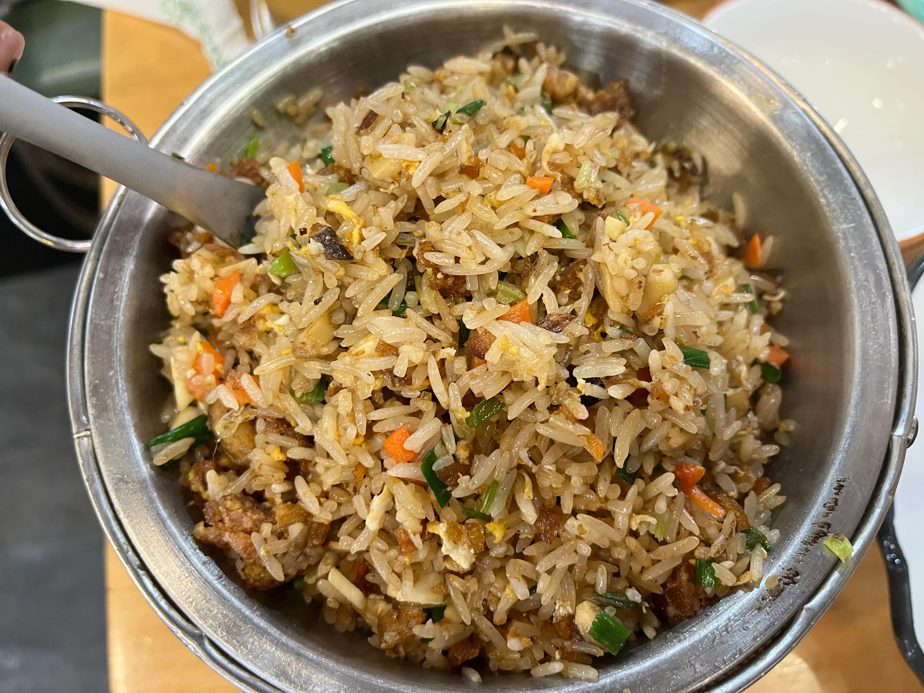 永嘉吃的带鱼饭,除各种配料外,主要是加上了炸酥的带鱼渣,吃起来口感鲜香,和糯米饭有点类似。
