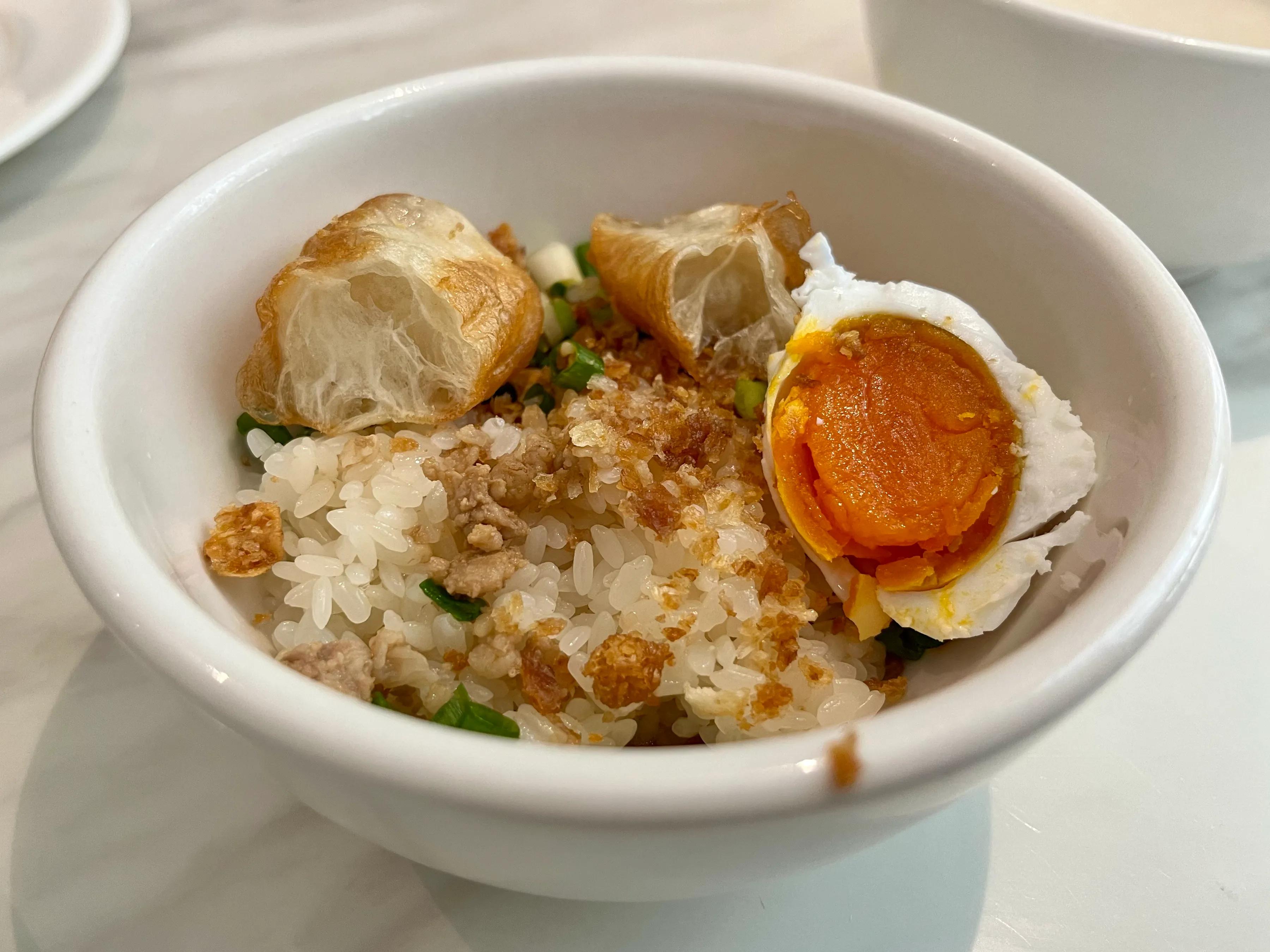 酒店里自己配置的糯米饭,配料有肉末汤、油条、葱末等,又加上半个咸蛋黄,口感软糯喷香。