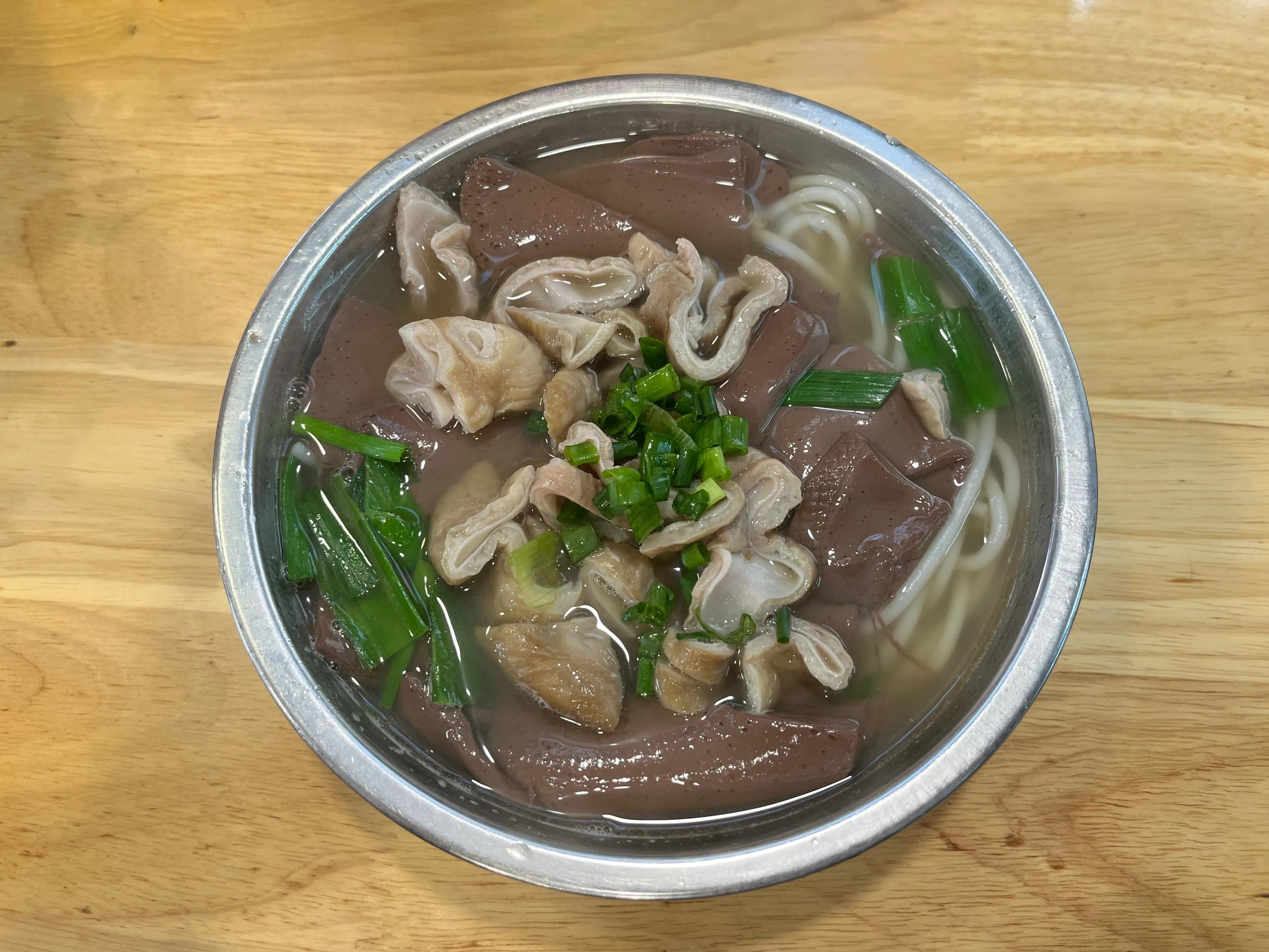 猪脏粉闻起来隐约有点臭,吃起来味道还是不错,大肠软烂,猪血口感像是挤压出水分一样。