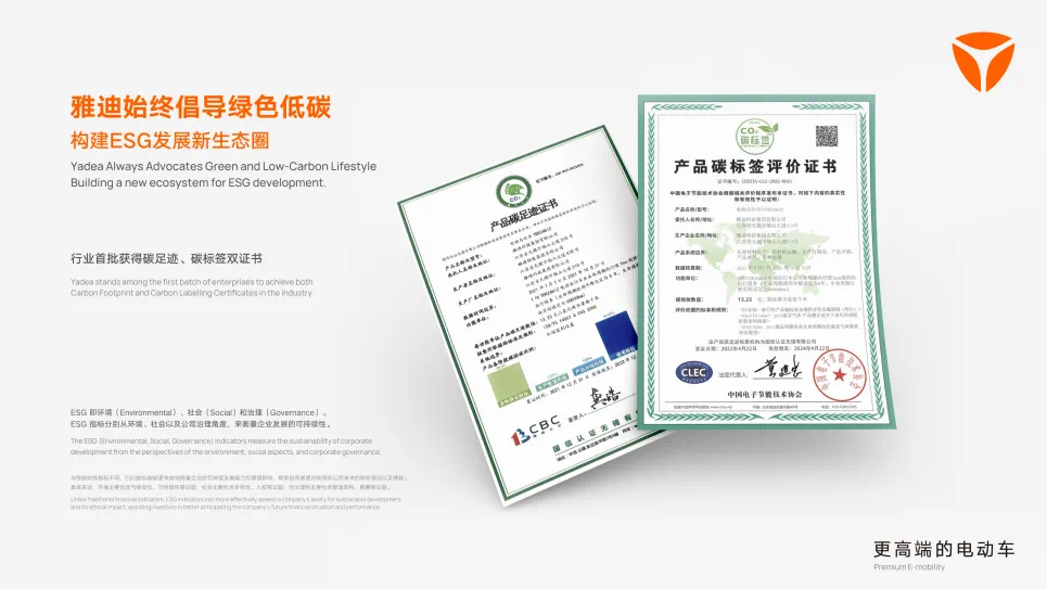 从20年8月推出的冠能系列开始,雅迪的产品便在续航、动力、安全、舒适等多方面实现了质的飞跃,成为绿色出行典范。同时雅迪还参与完成电动两轮车碳足迹标准制定等相关工作,收获了全国首个企业碳标签评价证书等多项荣誉,取得ESG汽机车行业与亚太区最高评级奖章。