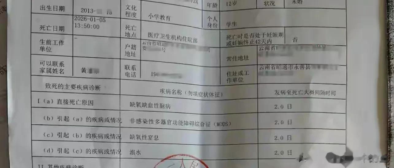 死亡证明上写着男孩的死因,溺水引起的缺氧缺血性脑病。