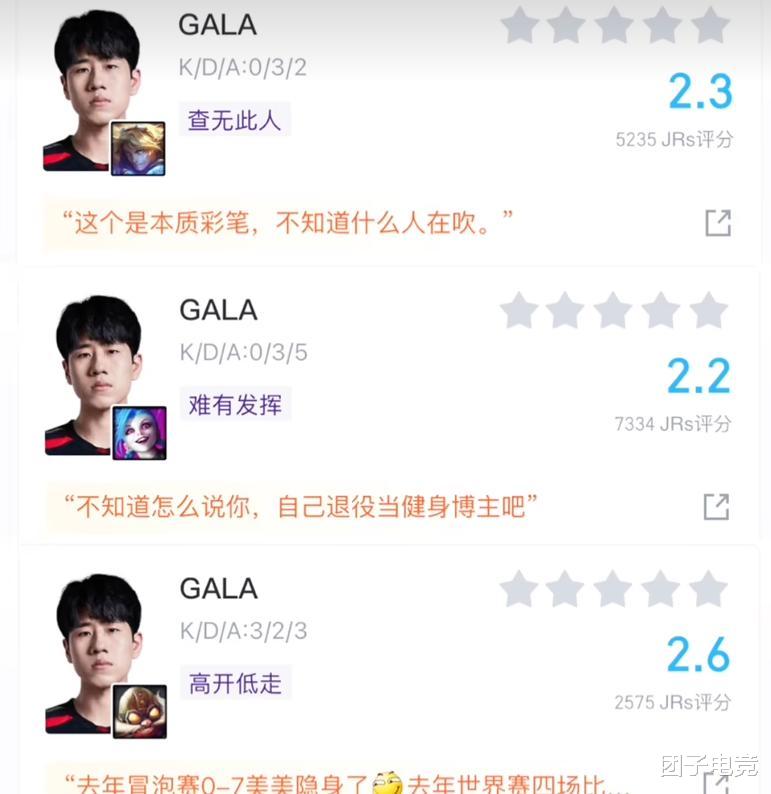 上面我们说了hongq和xiaoxu都在对位打出东西了,唯独没有说Gala的情况,他三场比赛纯隐身了,要知道他是队伍里面唯一的老选手,大家都需要他来给队伍兜底的。
