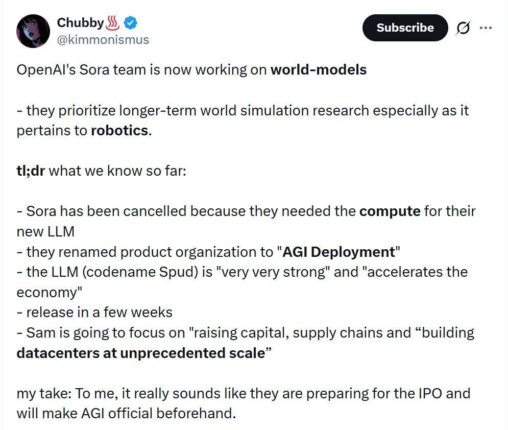 与此同时,一系列配套动作也在同步展开:Sora 被取消,腾出算力资源用于新一代大模型;产品组织更名为「AGI Deployment」,释放出更明确的战略信号;代号为 Spud 的新模型被内部评价为非常强,并有望在数周内发布;而 Sam Altman 的重心,则转向融资、供应链以及大规模数据中心建设。