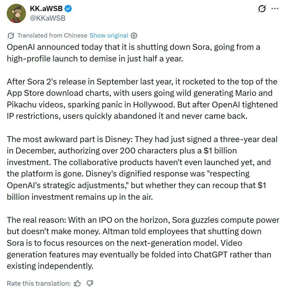 如今,Sora 的突然关闭也给这项交易带来了冲击。