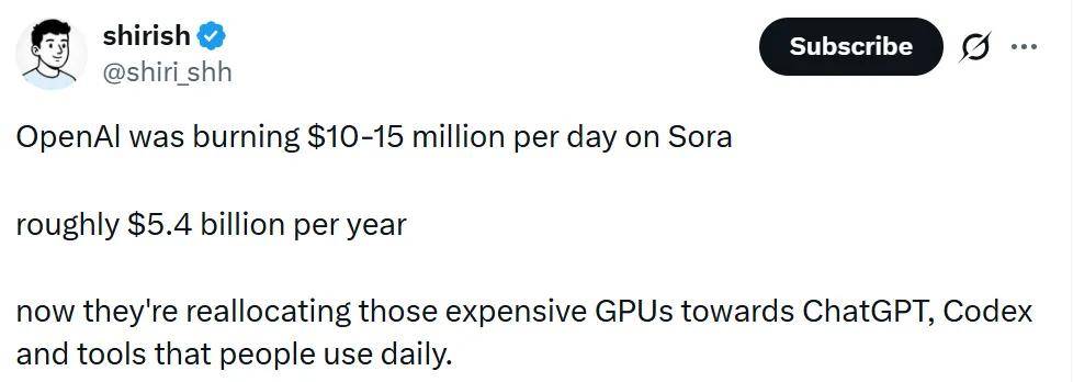说到底,还是太烧算力了:「OpenAI 在 Sora 上每天大约烧掉 1000 万到 1500 万美元,折合下来一年约为 54 亿美元。现在,他们正把这些昂贵的 GPU 资源重新分配到 ChatGPT、Codex 以及那些用户日常真正会用到的工具上。」