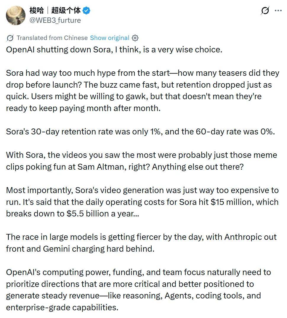 还有人认为,OpenAI 关闭 Sora 是一个非常明智的选择。