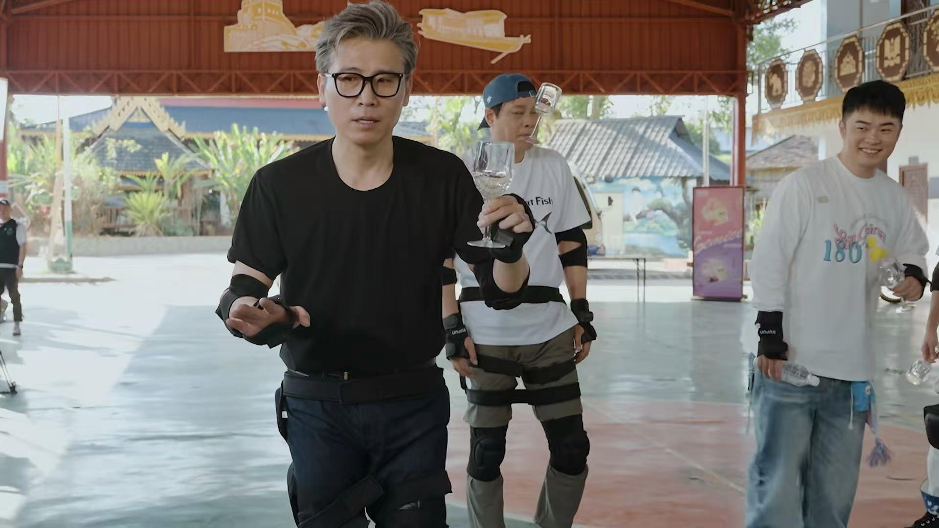 随后的旱冰鞋接水互动中,李乃文坚持执行这套行走方法论,一边小步“蹭”着前进,一边小心翼翼地传水,整体看上去笨拙得像个刚学走路的企鹅,却又有着莫名的执着和认真。