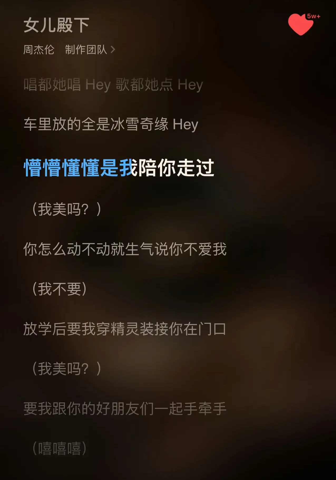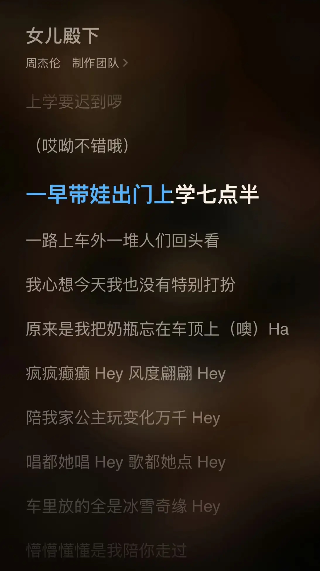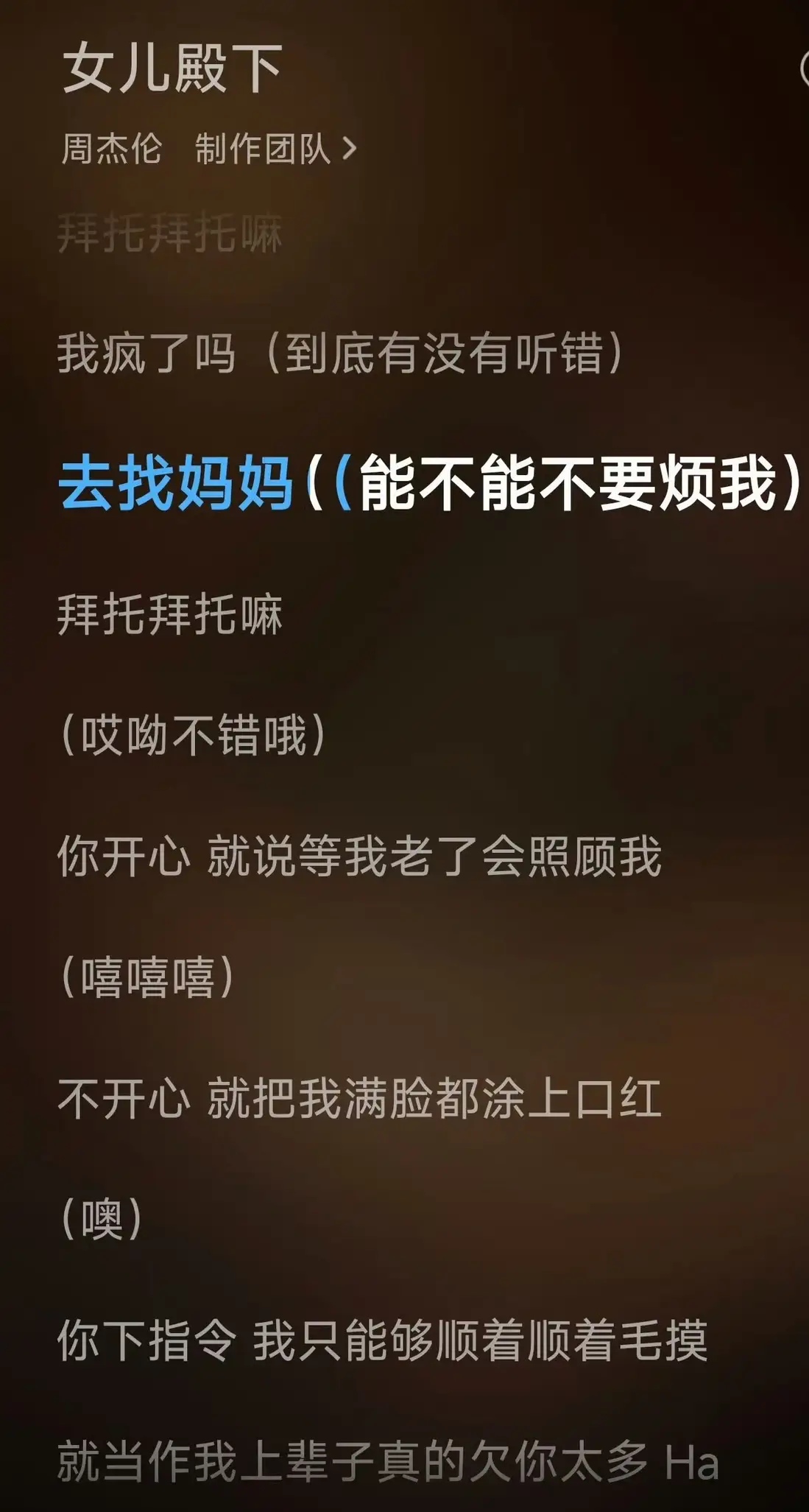 这首歌完全是周杰伦的带娃日记实录。歌词里写着“车里循环《冰雪奇缘》”“满脸口红印”“奶瓶忘车顶”,桩桩件件都是小女儿Jacinda的“杰作”。更逗的是,他还写了自己被逼无奈的吐槽:“我疯了吗?去找妈妈!”活脱脱一个被女儿折腾到想“甩锅”的奶爸形象。最戳人的是,歌曲里还穿插了女儿奶声奶气的撒娇声,瞬间让整首歌的真实感拉满,仿佛能看到那个被女儿追着化妆的天王奶爸。