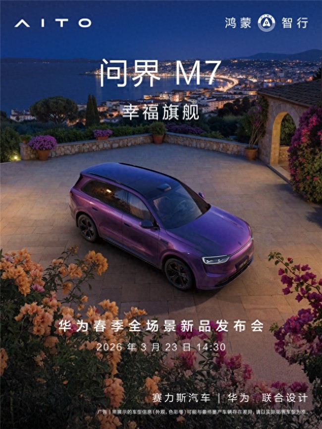 3月23日,当“夜紫”新色与全新问界M7的硬核实力相遇,不仅将为消费者带来更具个性的新选择,更将与43万车主一起,共同开启一段关于审美、关于科技、关于幸福的崭新旅程。